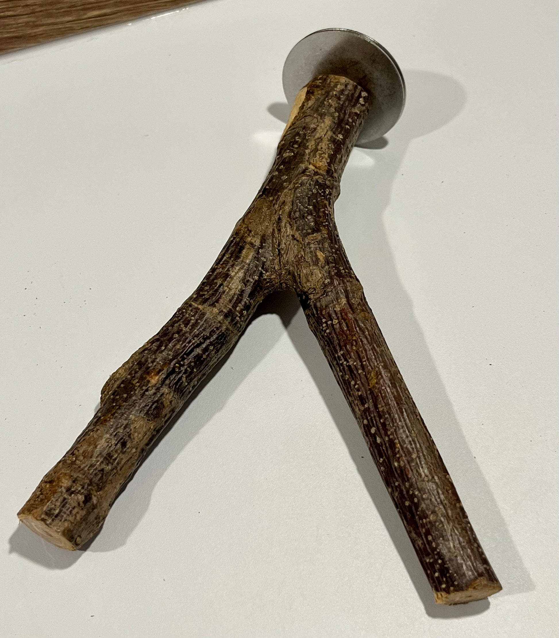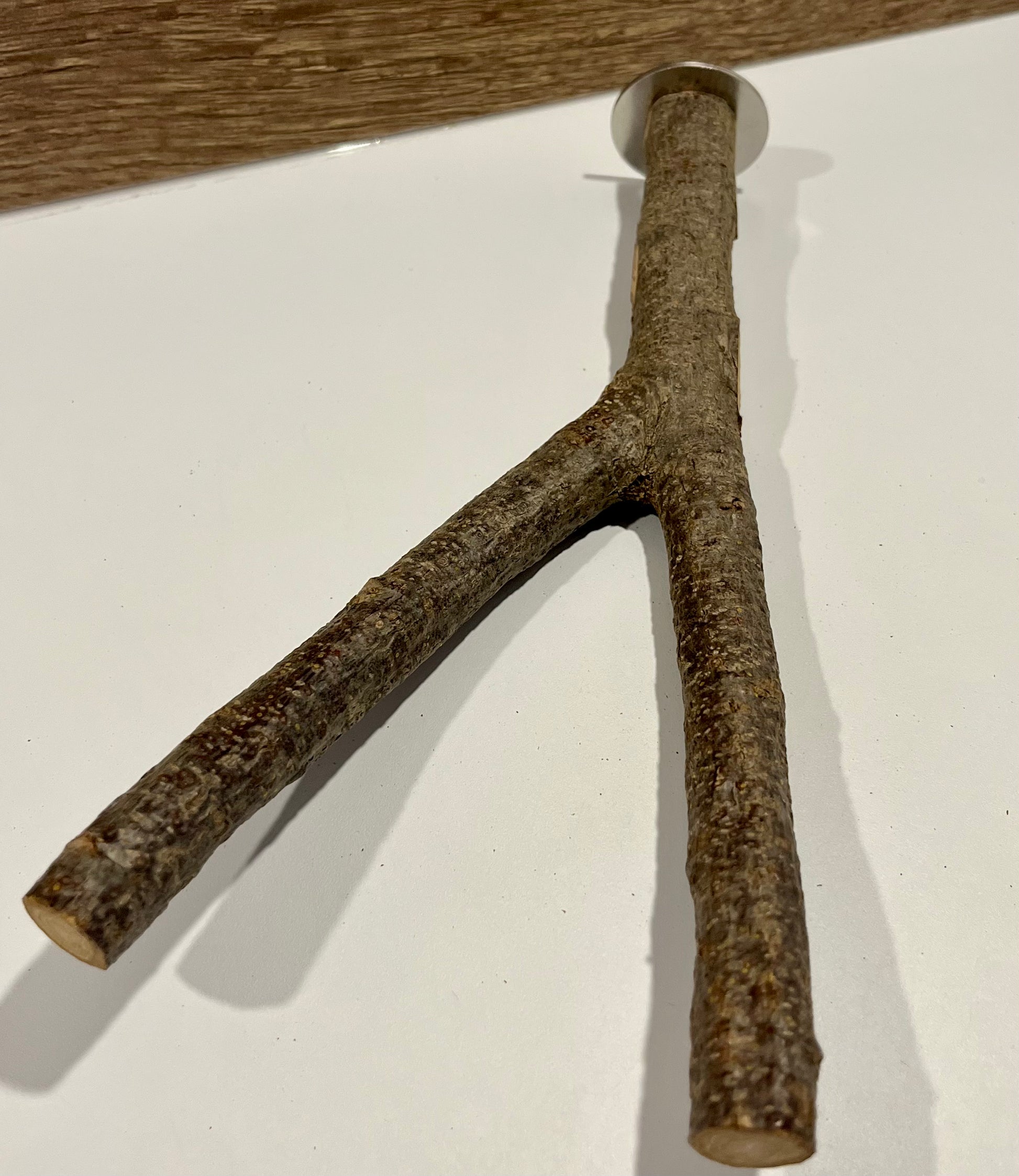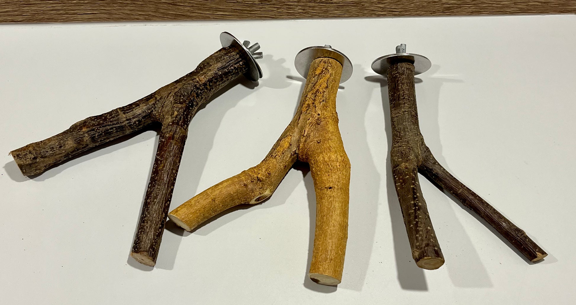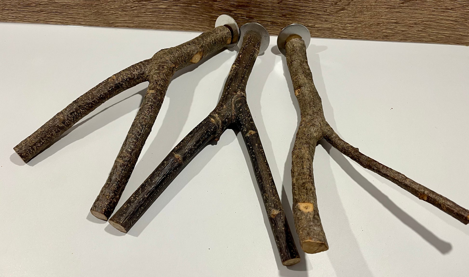 Y shaped branches from an apple tree that can easily attach to the cage bars using the provided washers and bolt. One provided at random. This is a natural product so they will all vary.