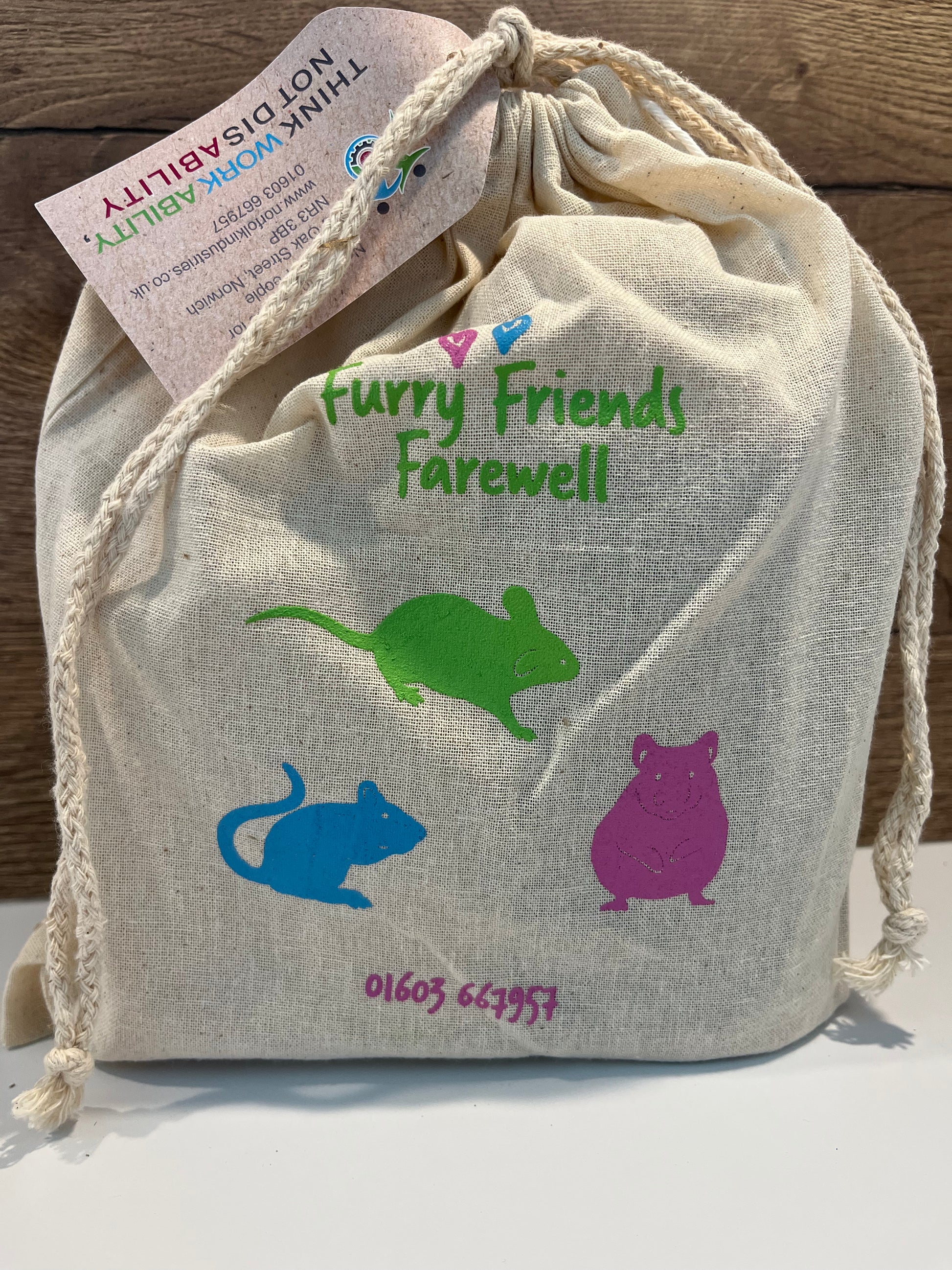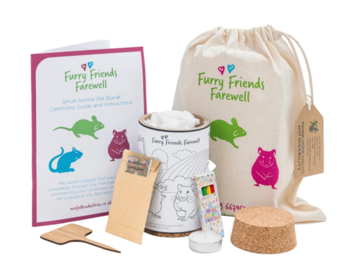 Eco-burial kit designed to engage children with the loss of their small pet. Kit comes complete with burial tube, soft bedding, grave marker, tealight, seeds for the grave, pencils for colouring the label, ceremony guide with information about how young children deal with grief. Biodegradable product with a drawstring bag which can be used to keep precious memories safe.