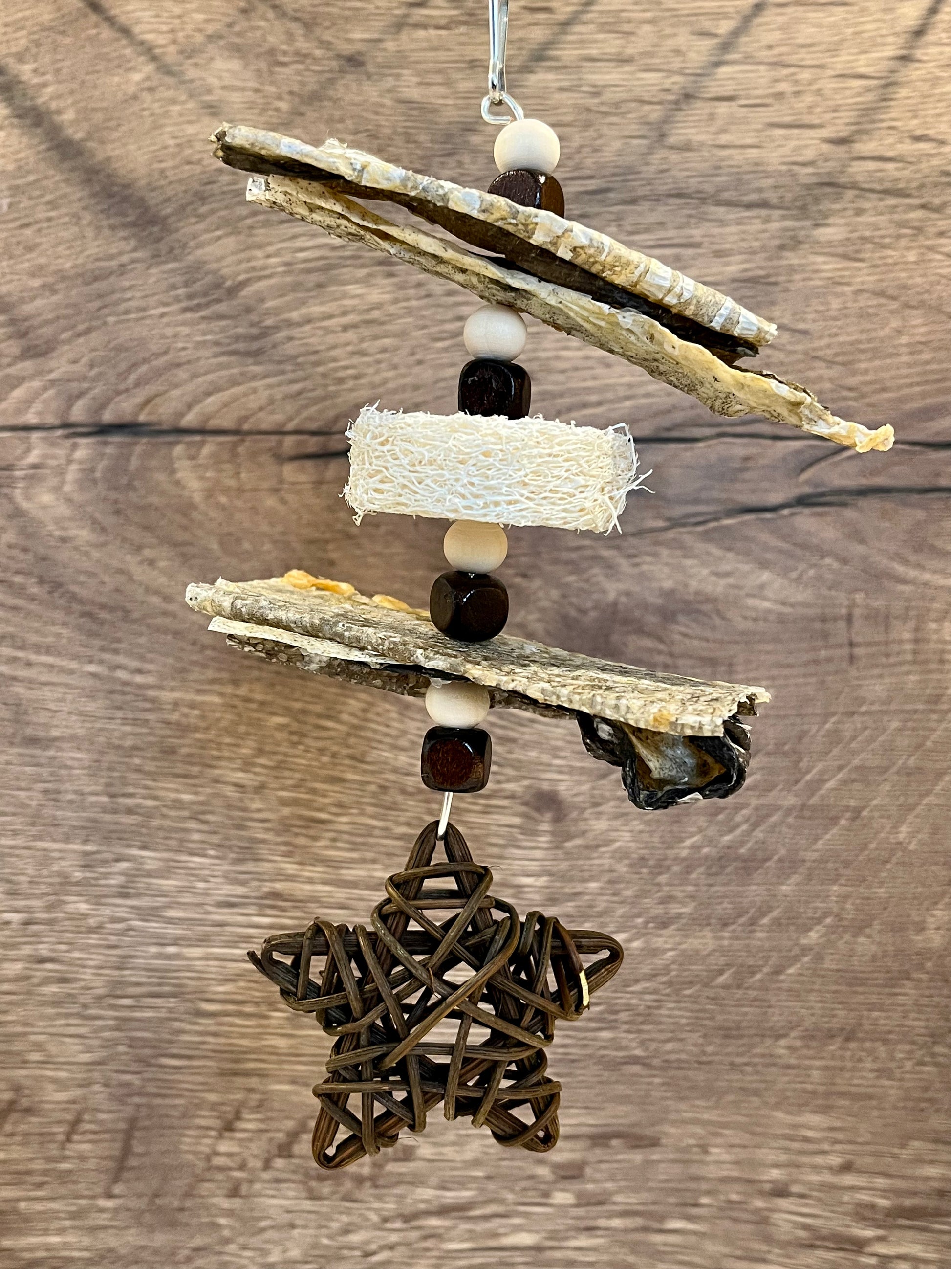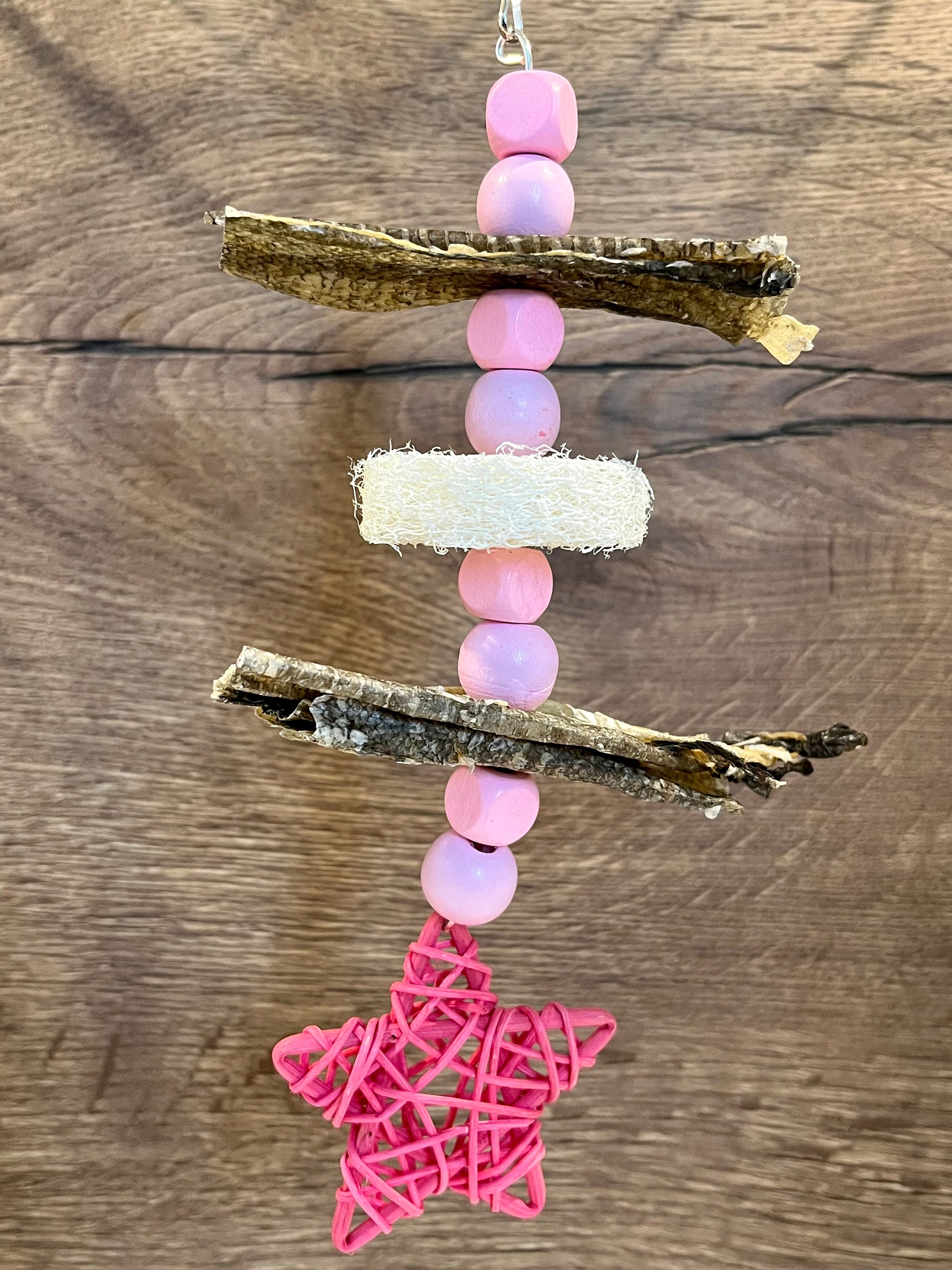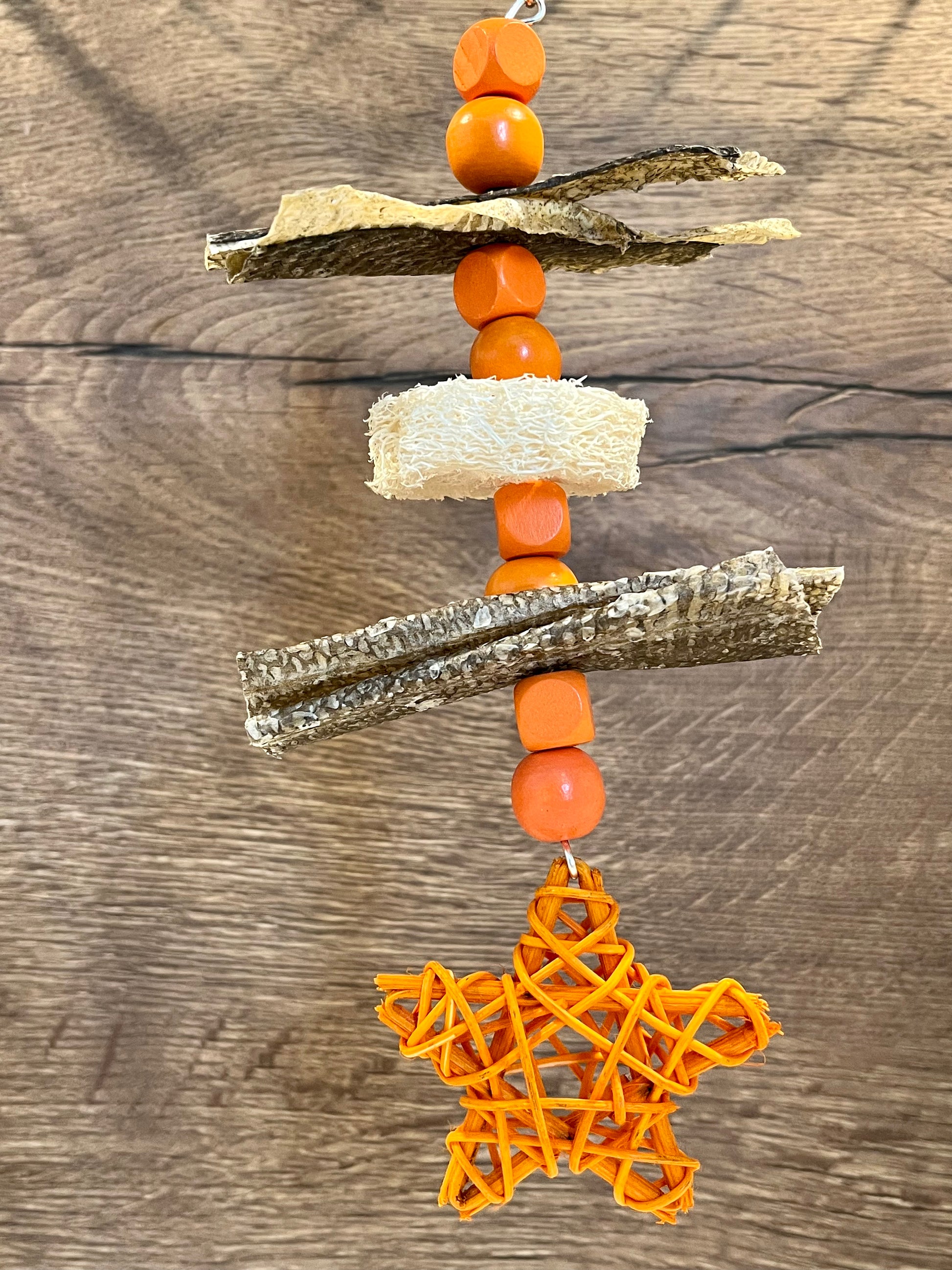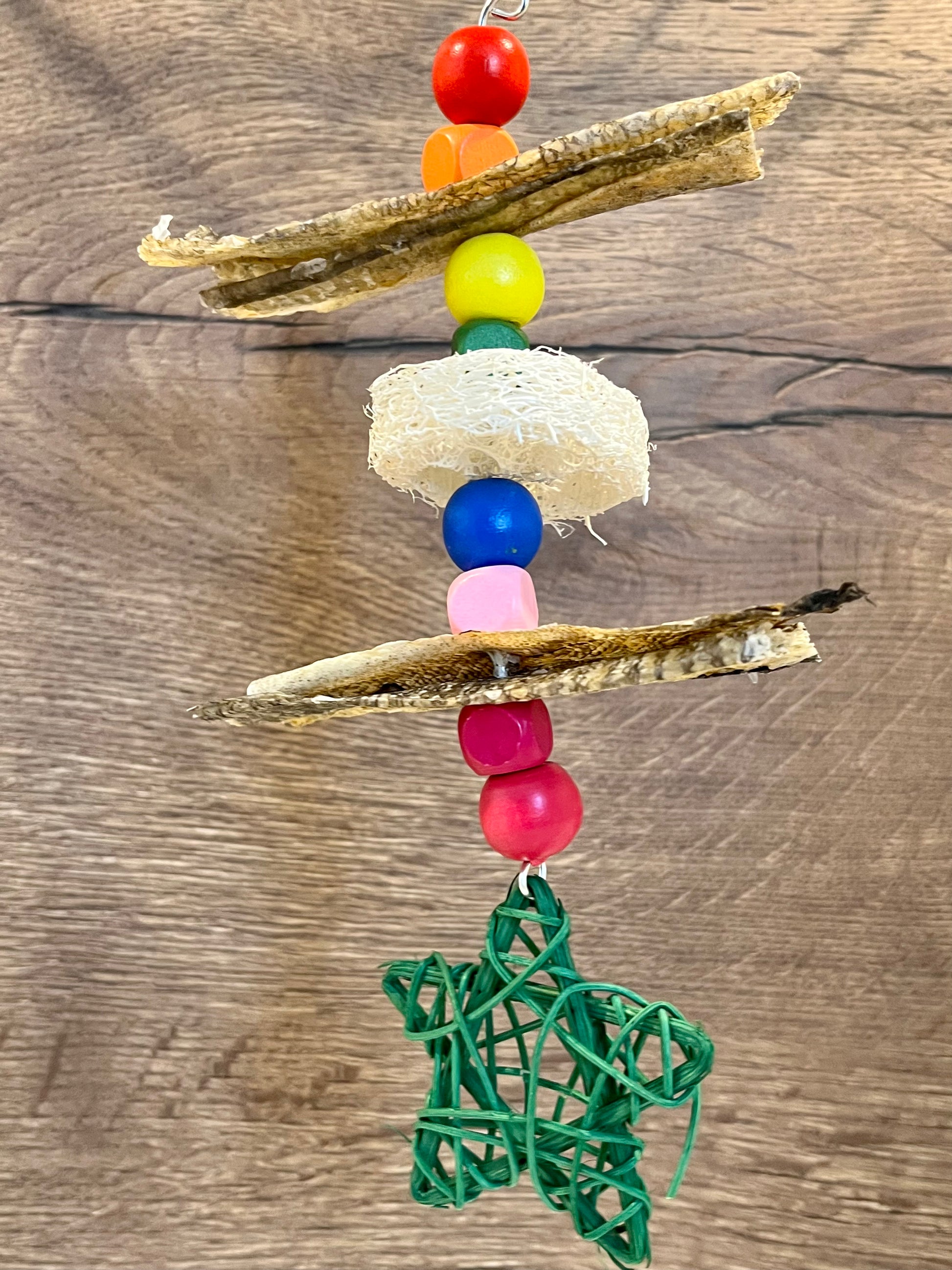 The fishy treat of your pets dream! This handmade toy has fish skins, loofah, round and square beads and finished with a rattan star. Size approximately 21cm x 10cm