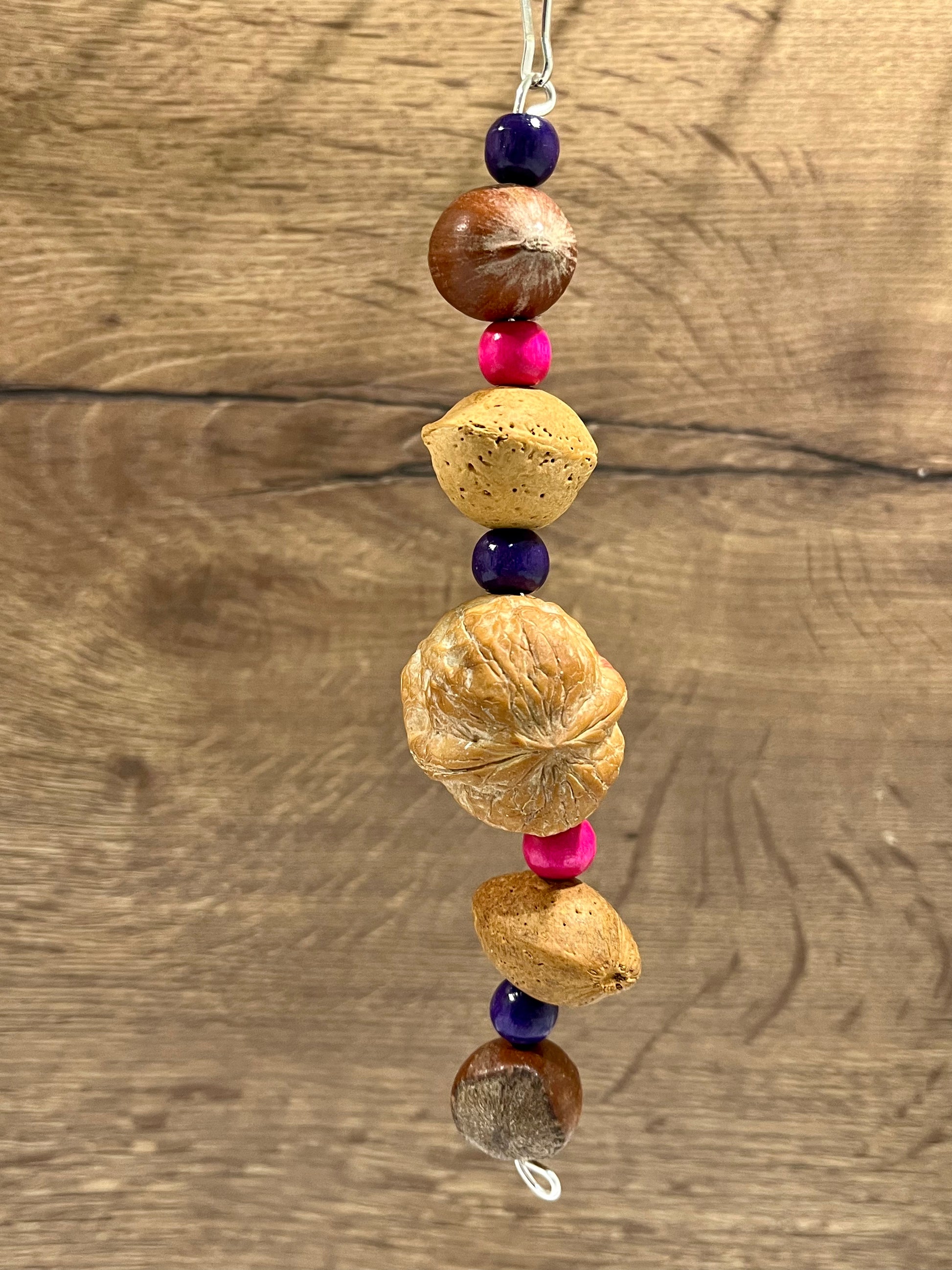 Keep your small pet very busy with this handmade shelled nut chew toy! Each toy has 1 walnut, 2 almonds and 2 hazelnuts all in shells to make for a long lasting toy. Due to the natural products used, nut size will vary. Size approximately 6.5 inches.