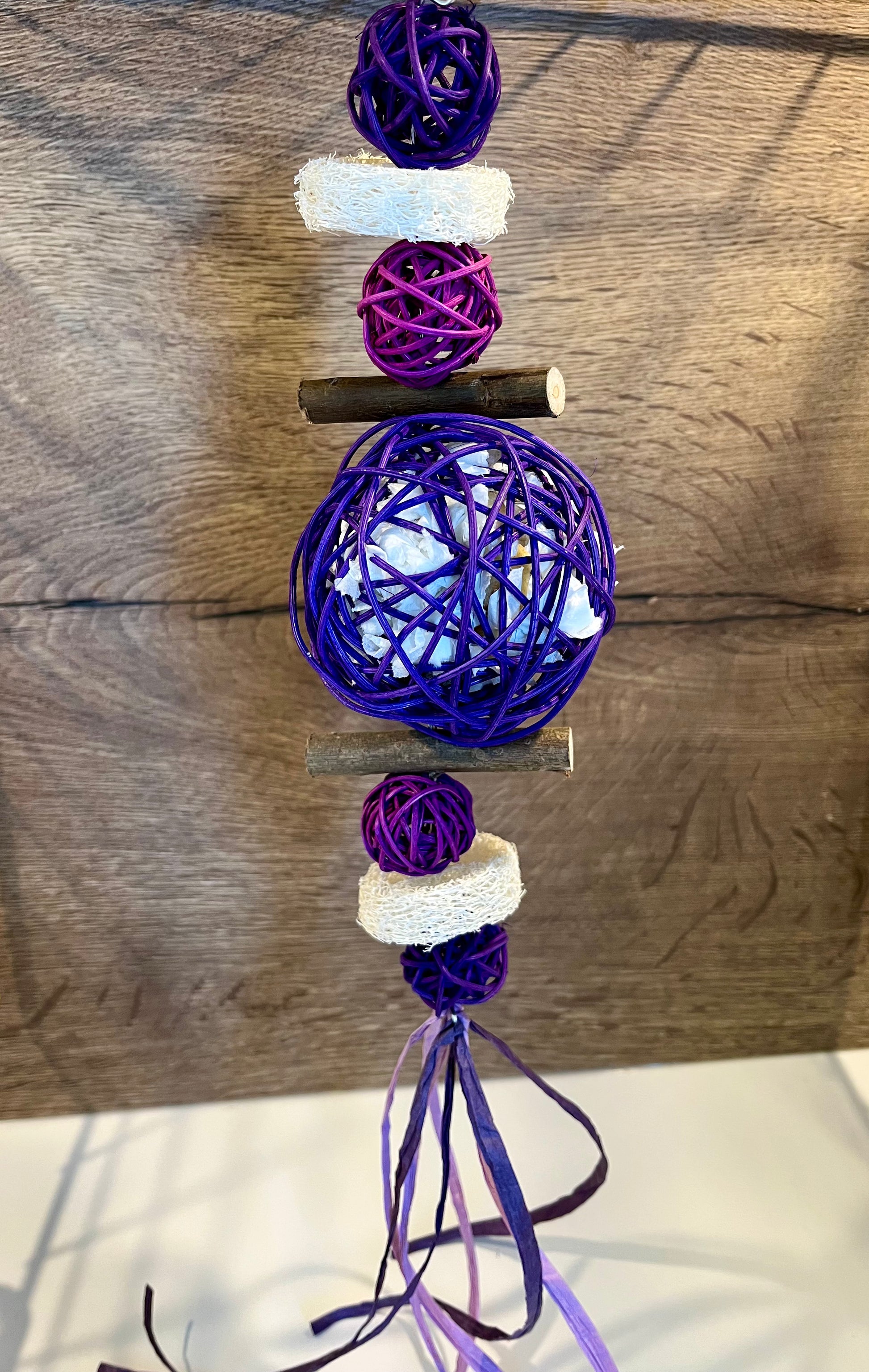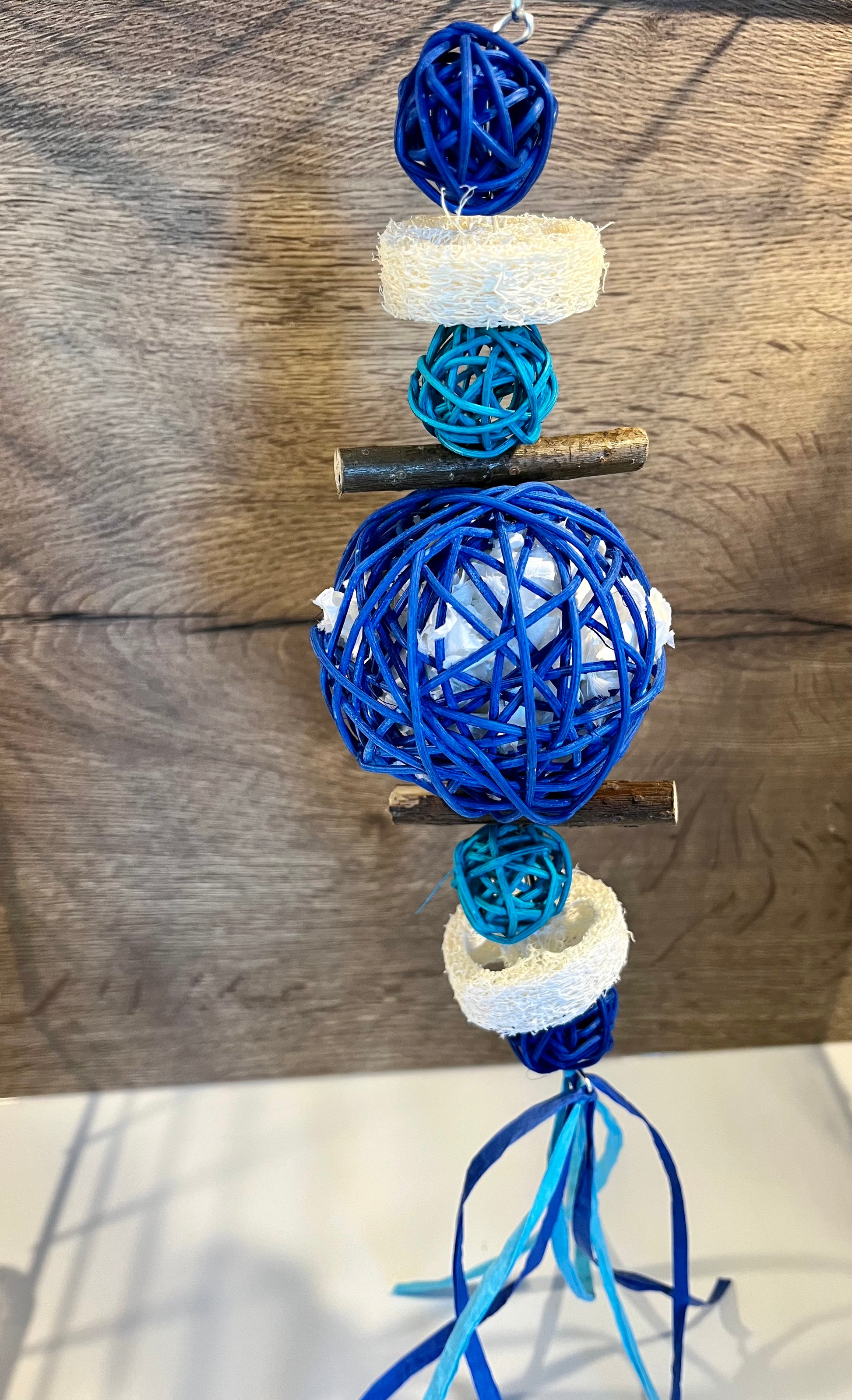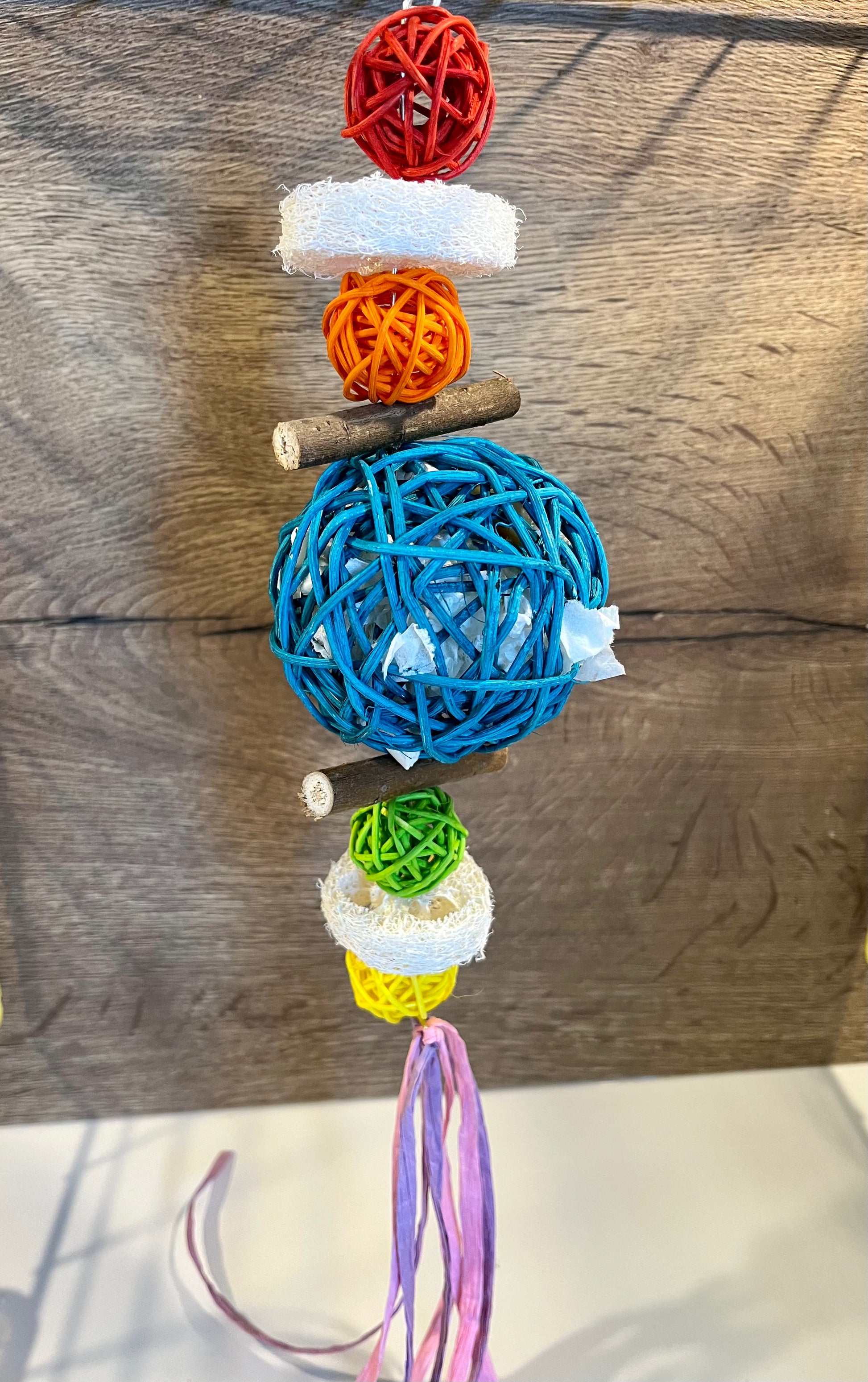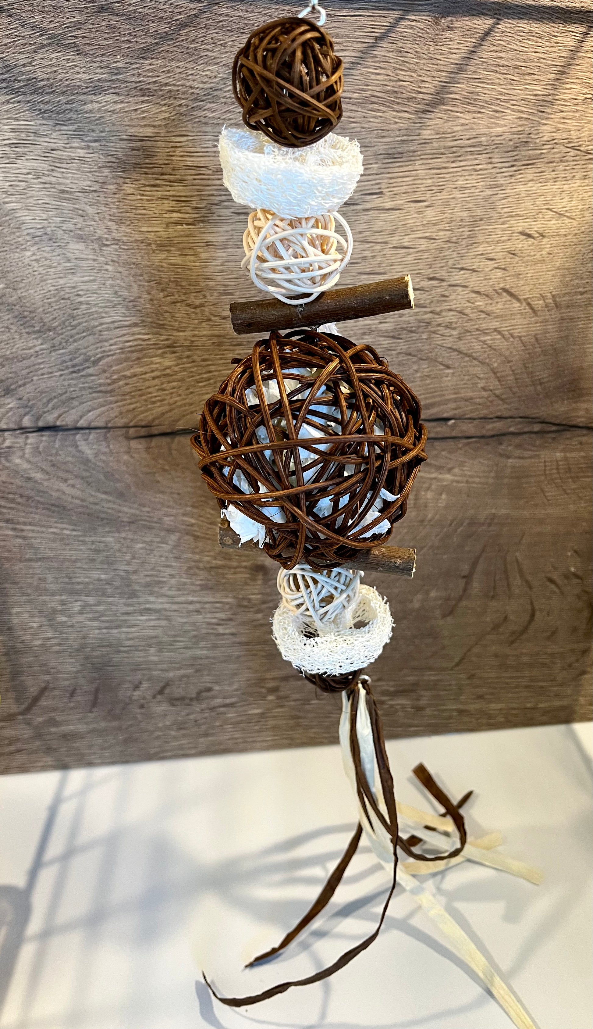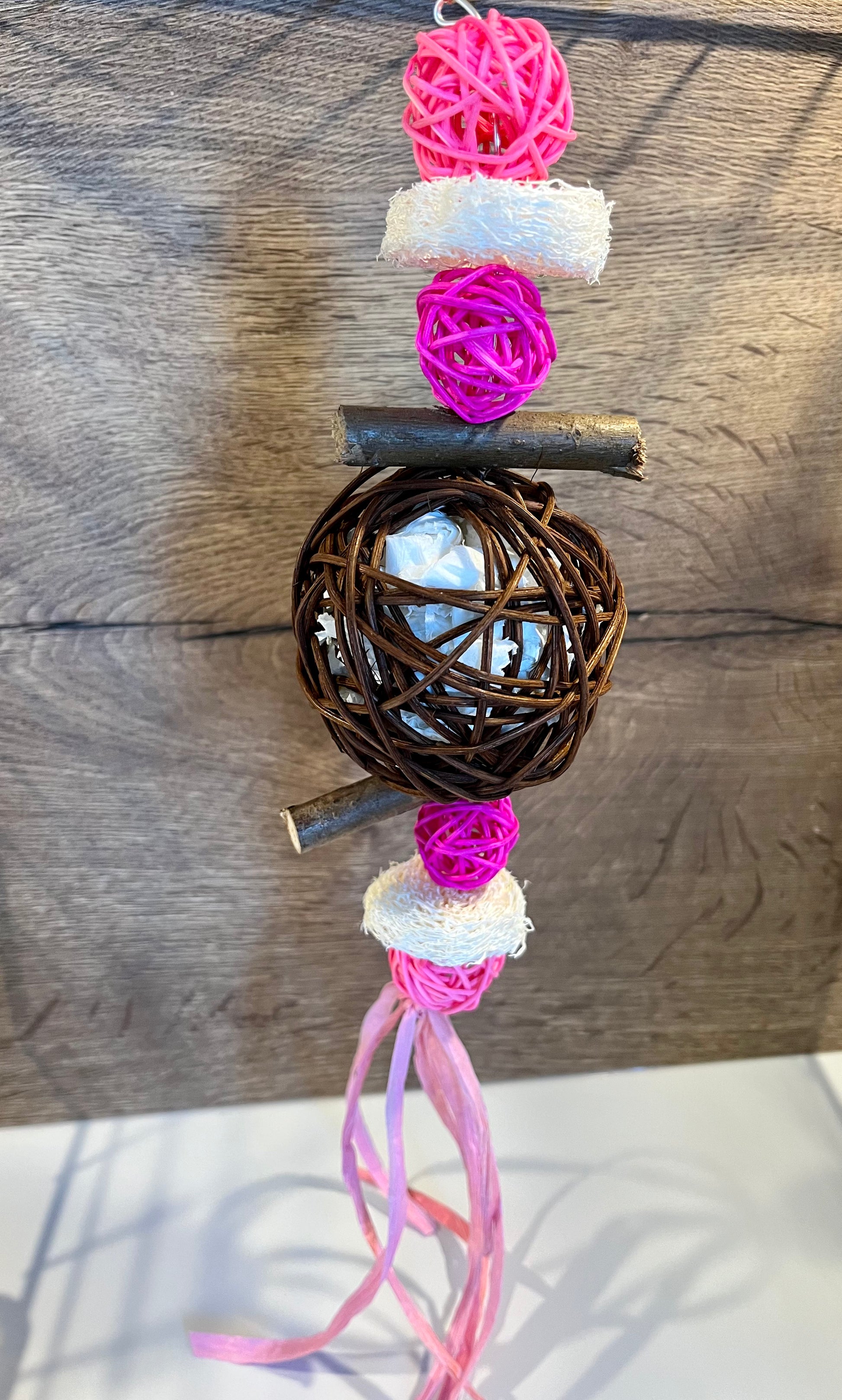 The central large rattan ball is packed full of teabag bedding, 2 shelled hazelnuts, whimzee slice and banana chips. In addition to this you also have smaller rattan balls, loofah, willow and rattan ribbon for a whole array of textures for the pet to enjoy.