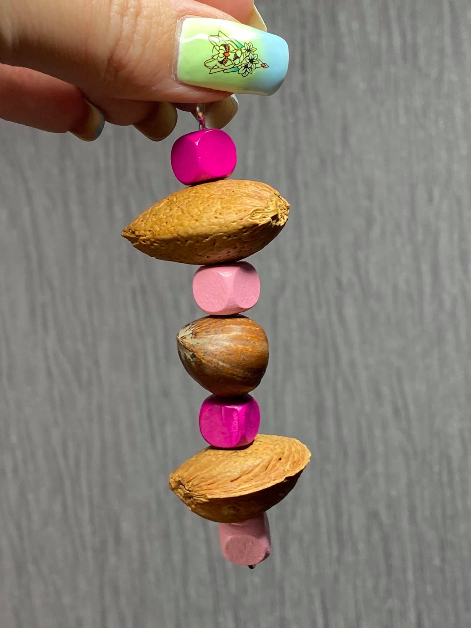 A cute little nut chew toy for your pet. Handmade using 3 shelled nuts and some wooden beads. Size approximately 4 inches.