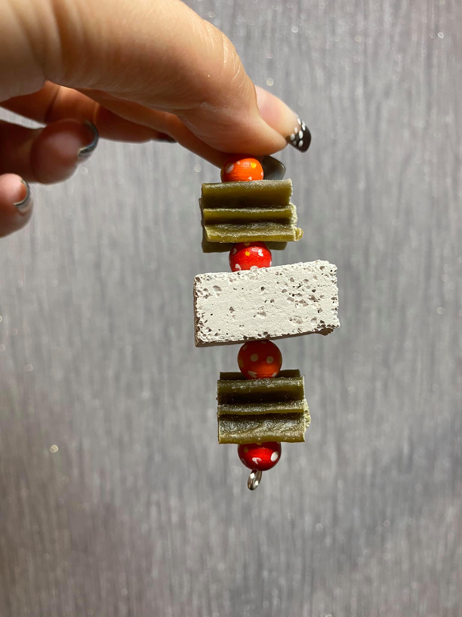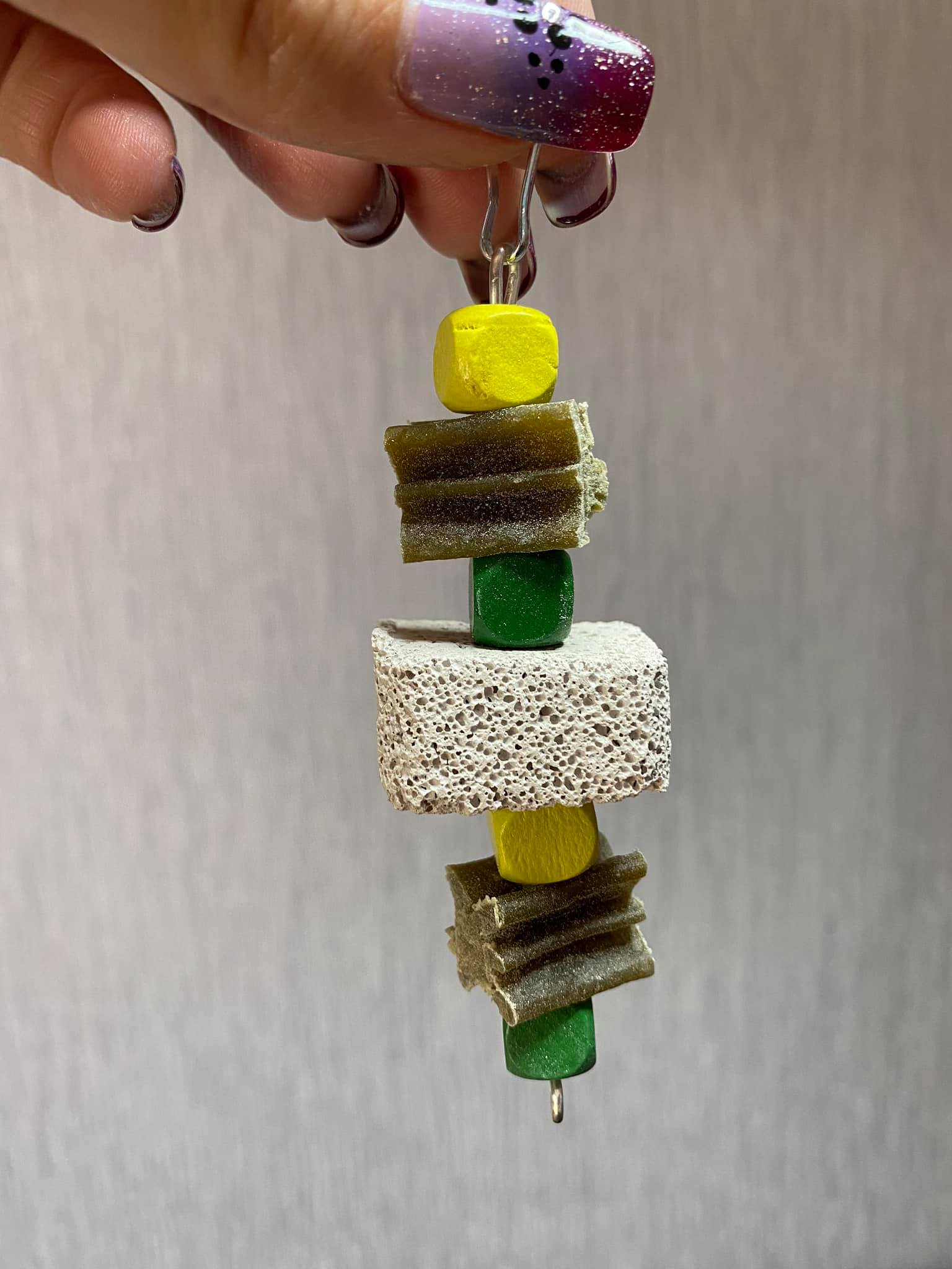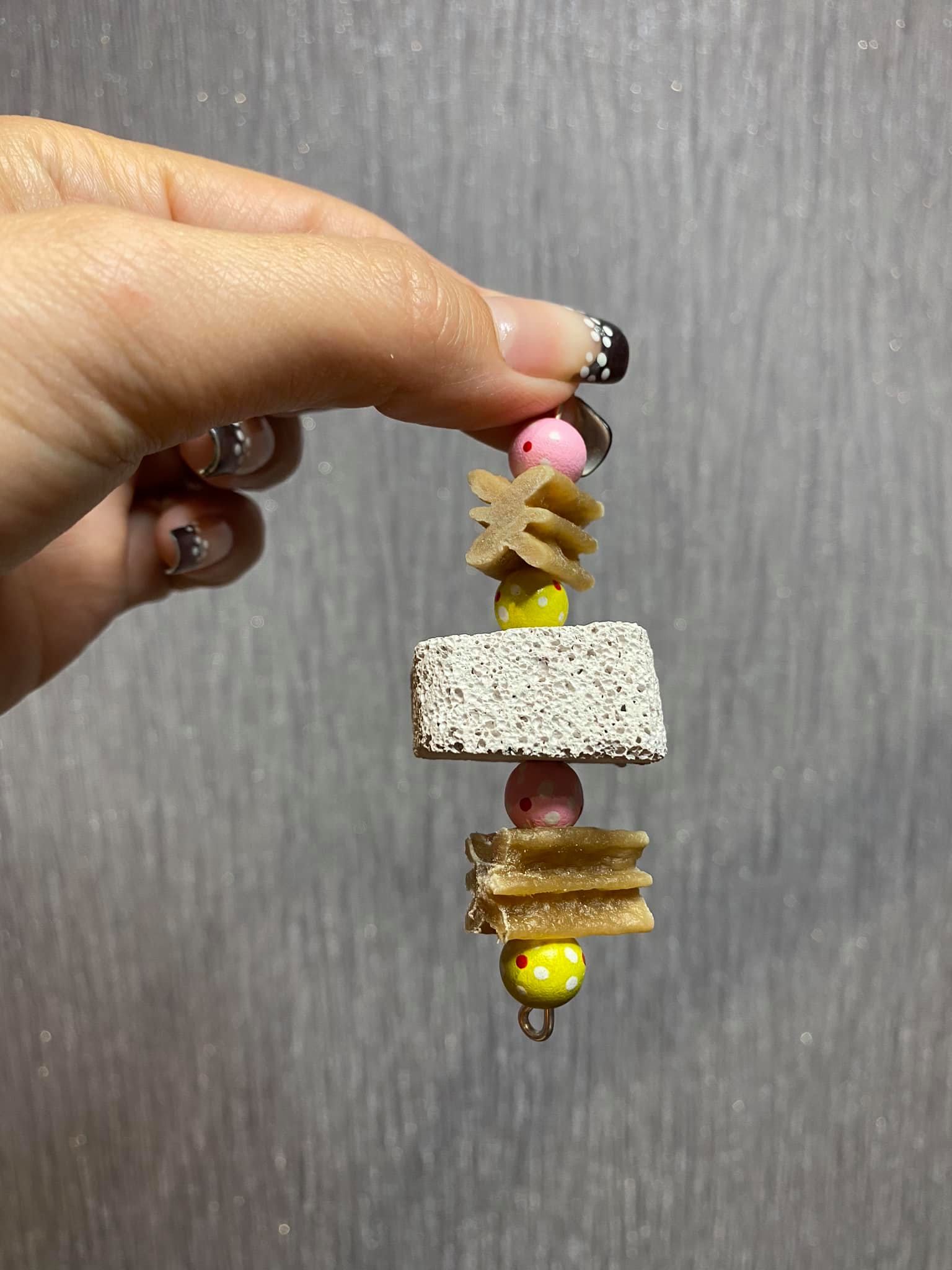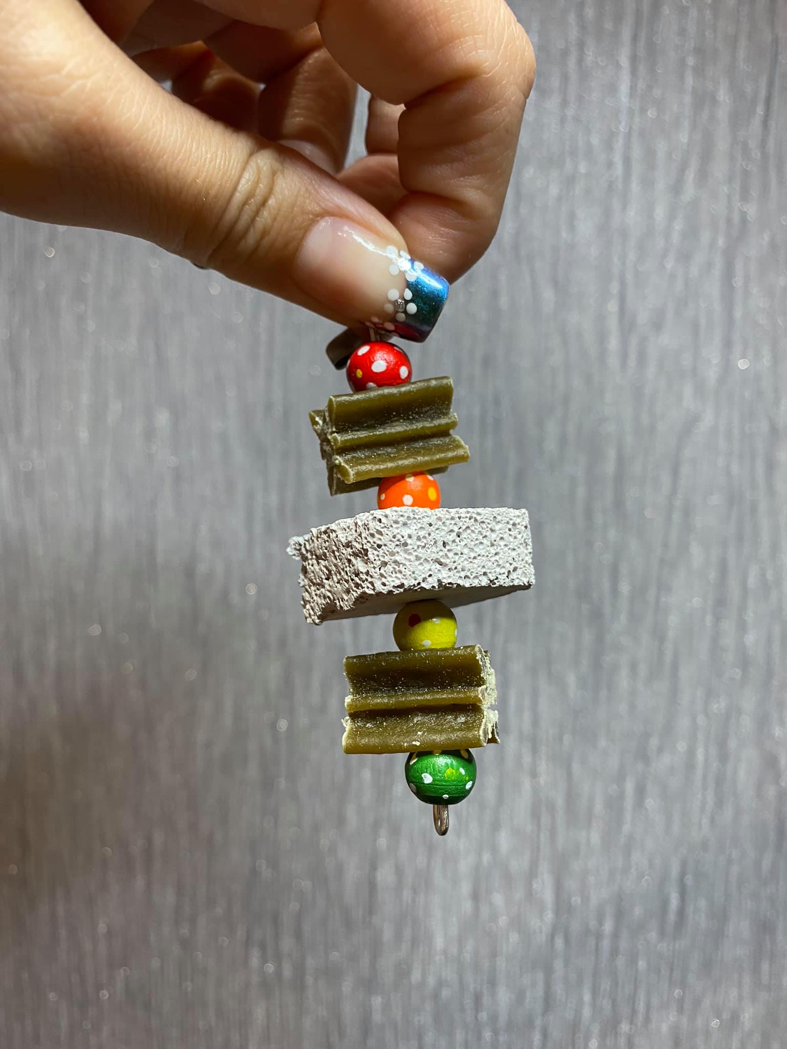 A yummy handmade treat toy for your small pet. Made using 2 pieces of whimzee, wooden beads and a pumice piece.