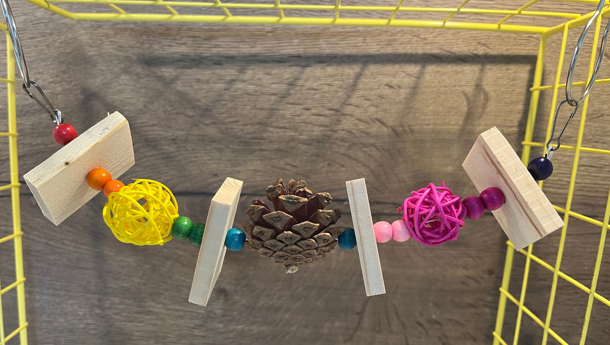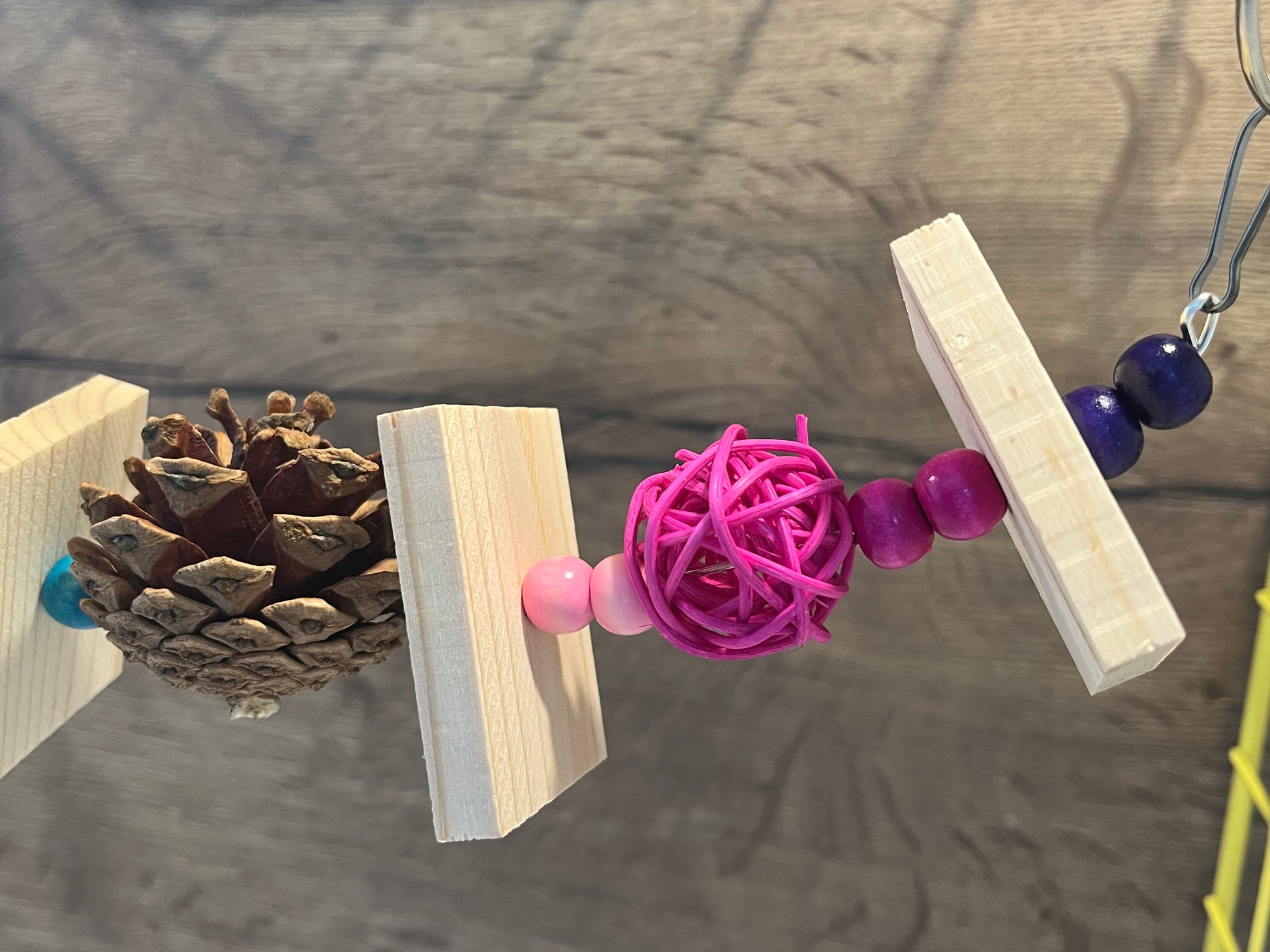A handmade chew toy made with wooden blocks, rattan balls, wooden beads and a central pinecone. You can choose to scatter small seeds into the pinecone to act as a foraging toy. Small food pieces can also be pushed into the rattan balls.