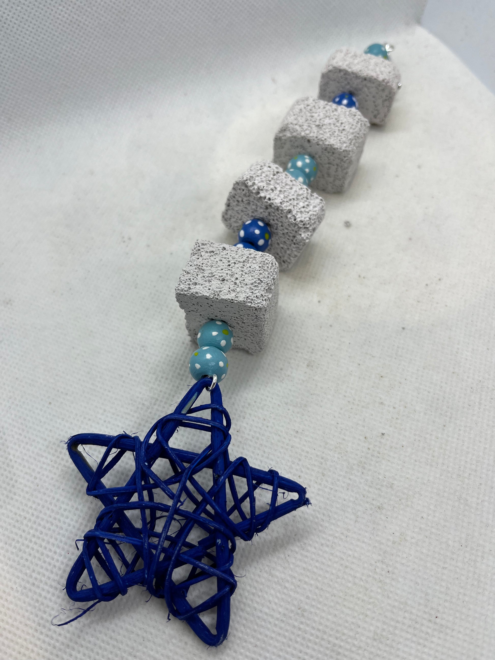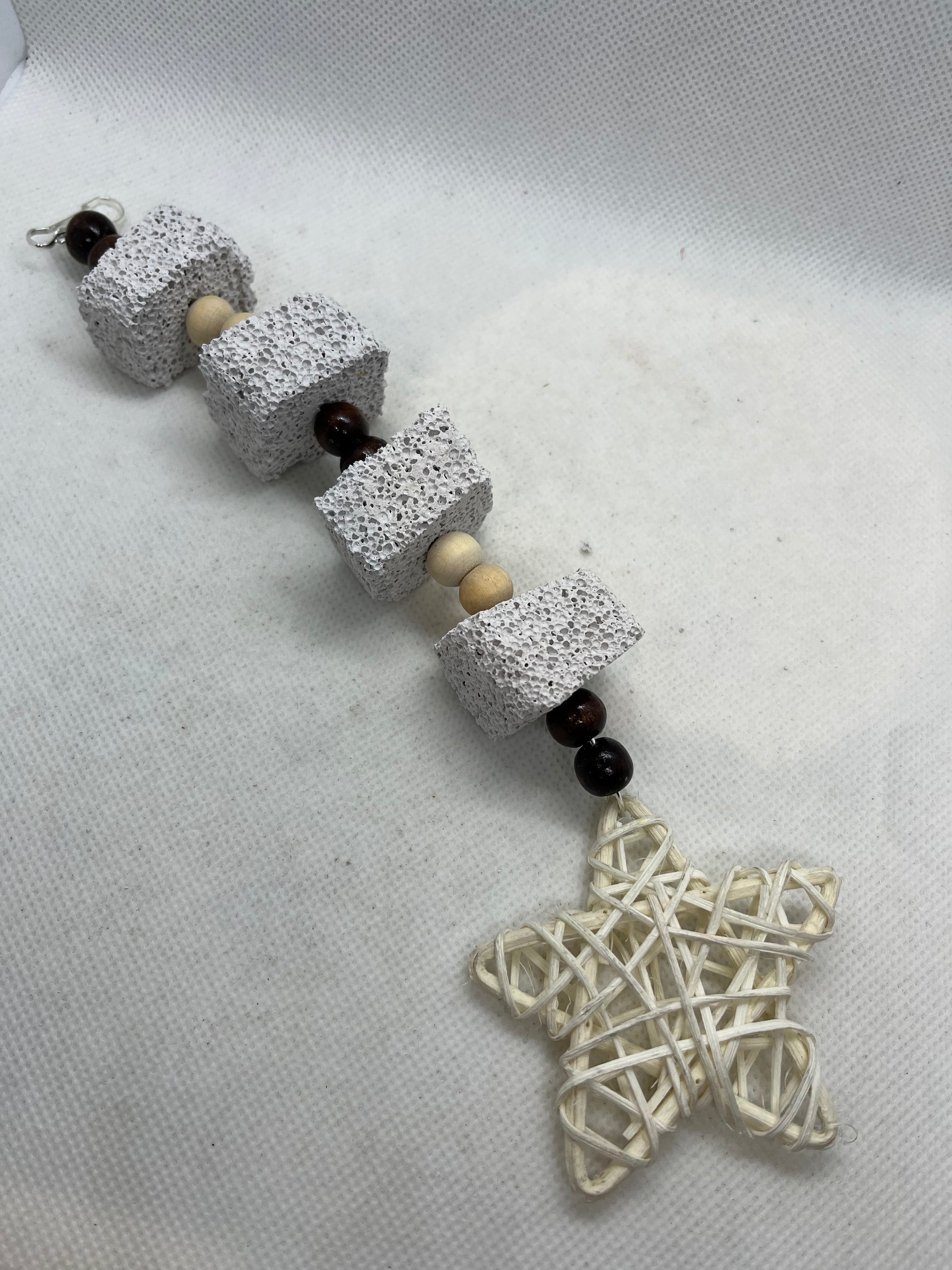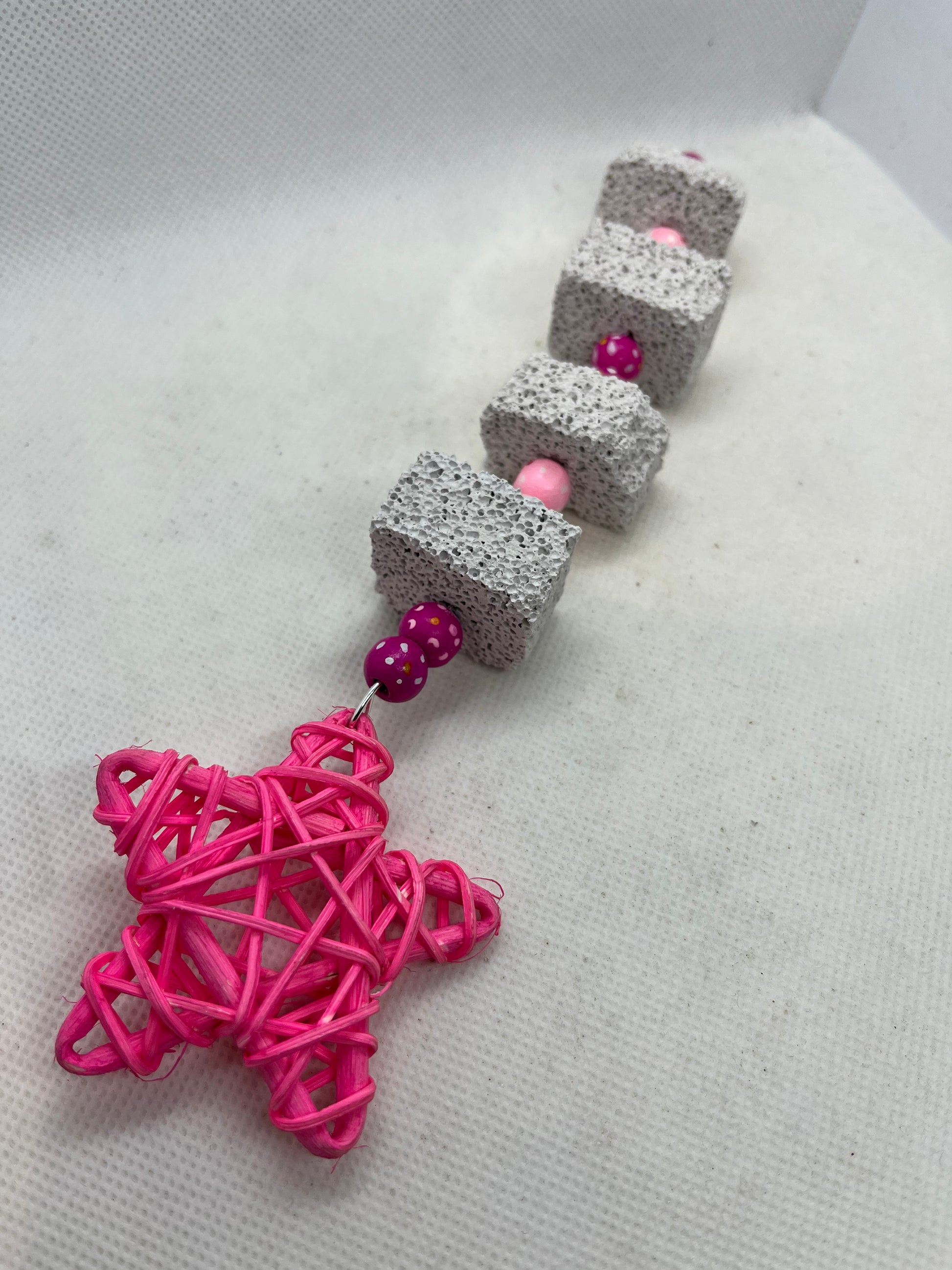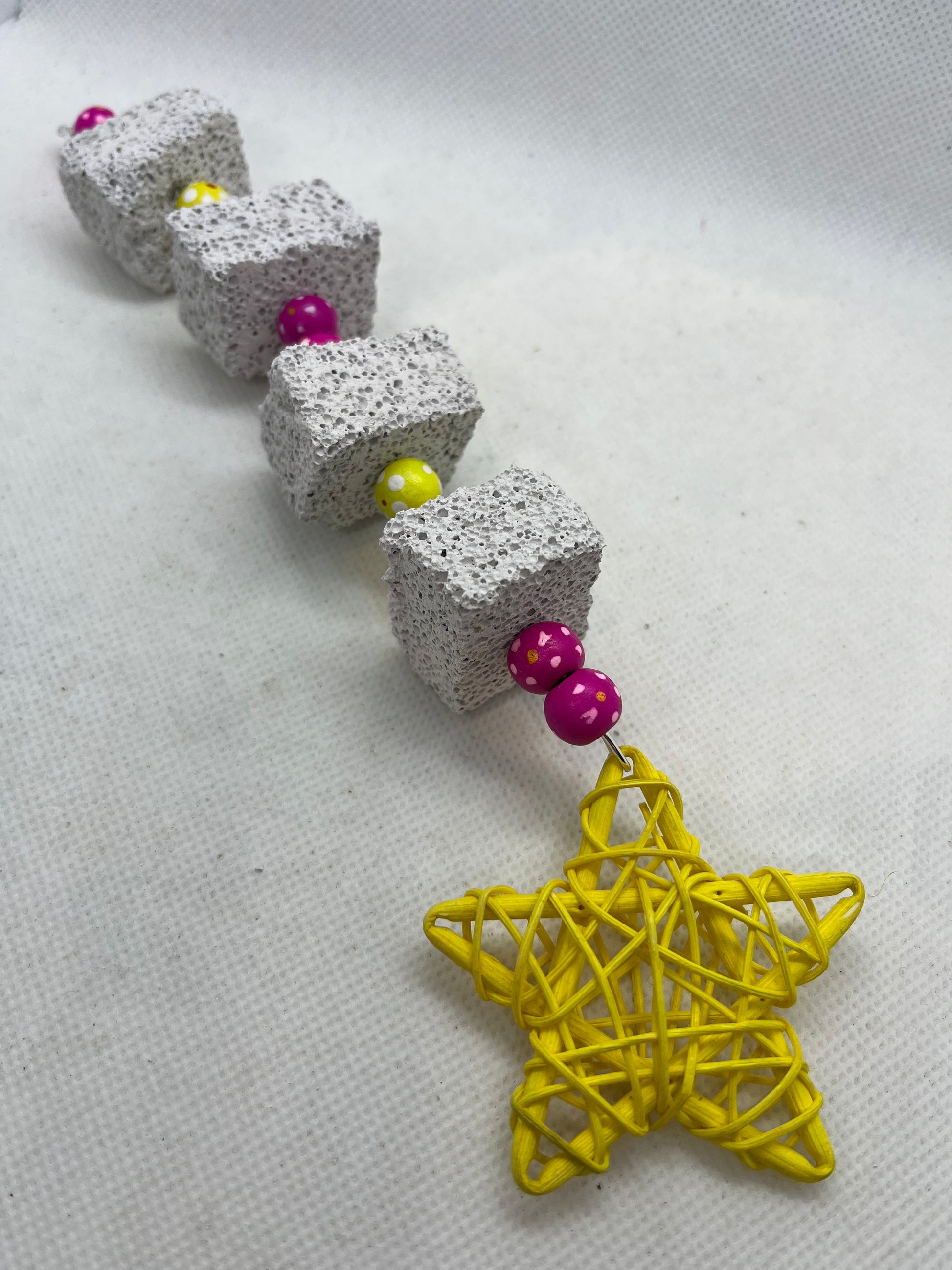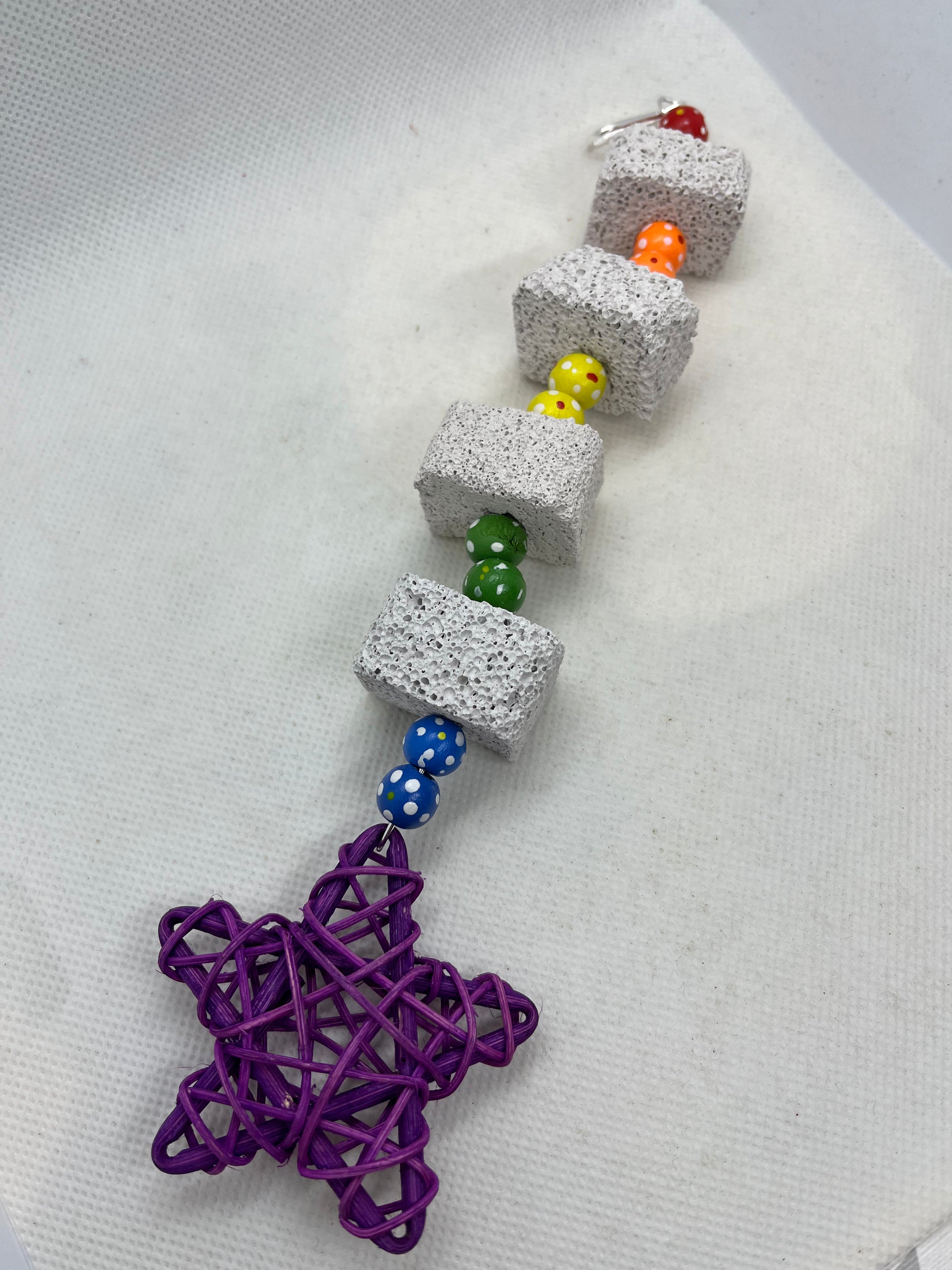 Pumice is a great chew toy for your small pets. This handmade toy is approximately 9 inches and is made up of 4 pumice pieces, coloured beads with dotted flower details* and finished with a colourful rattan star. Size approximately 24cm