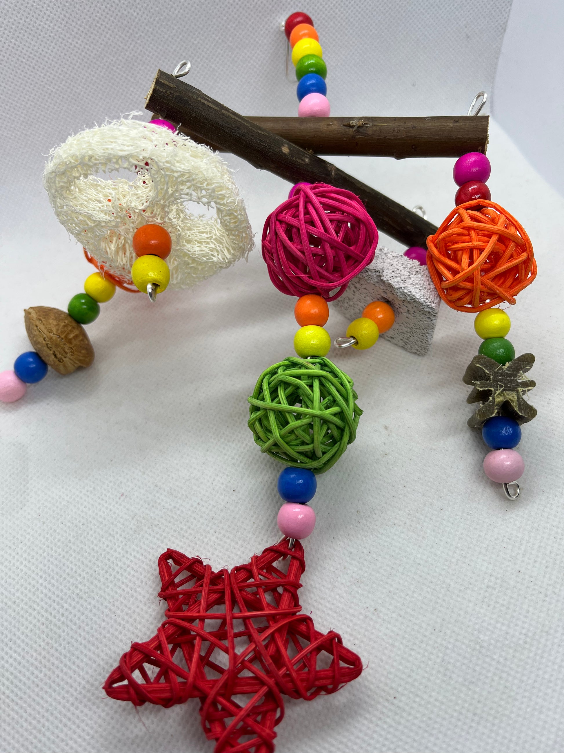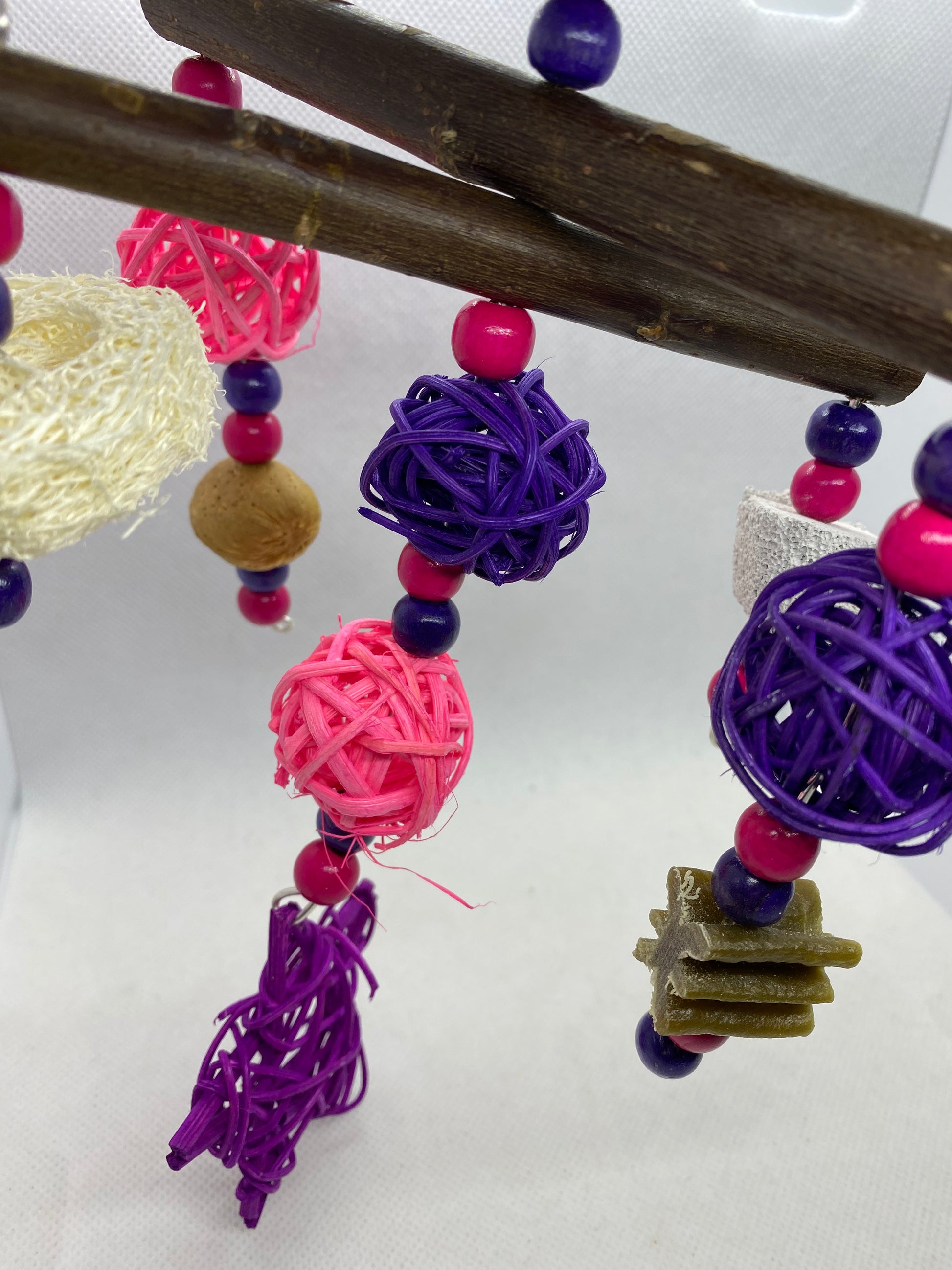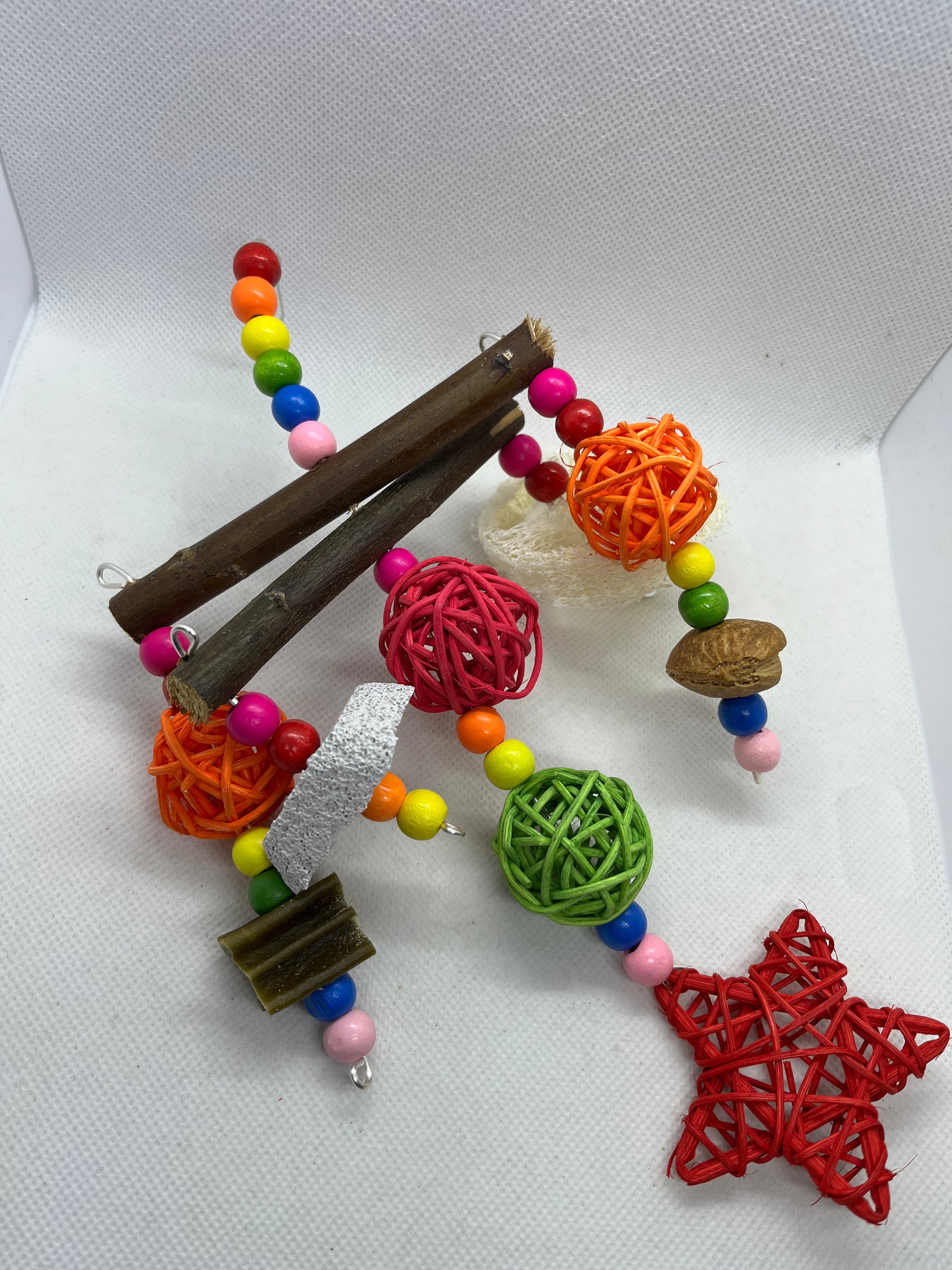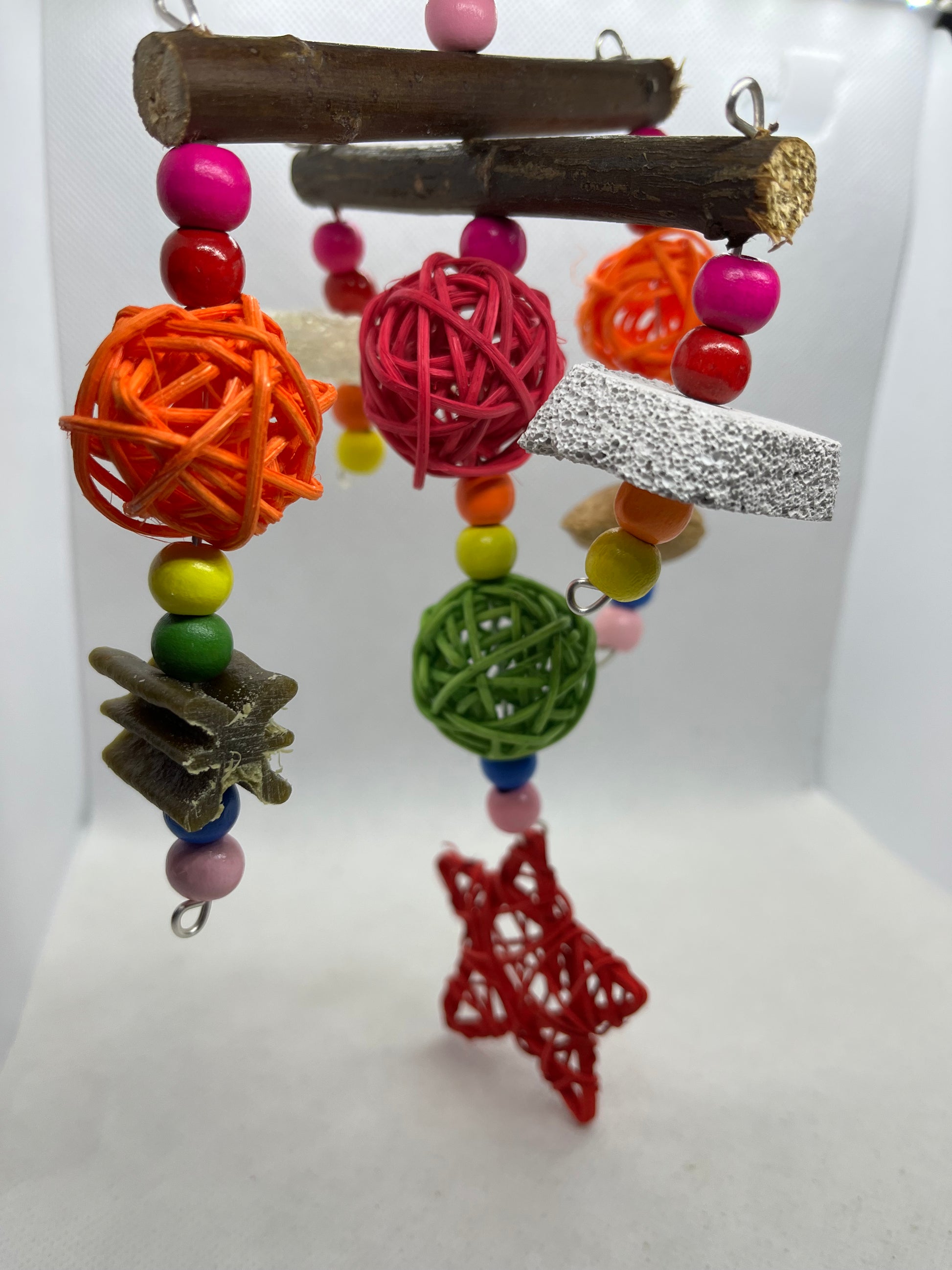 A fun interactive treat toy for your pets. This toy is made using wooden beads, willow, rattan balls/star, loofah, shelled almond, pumice piece and whimzee slice.