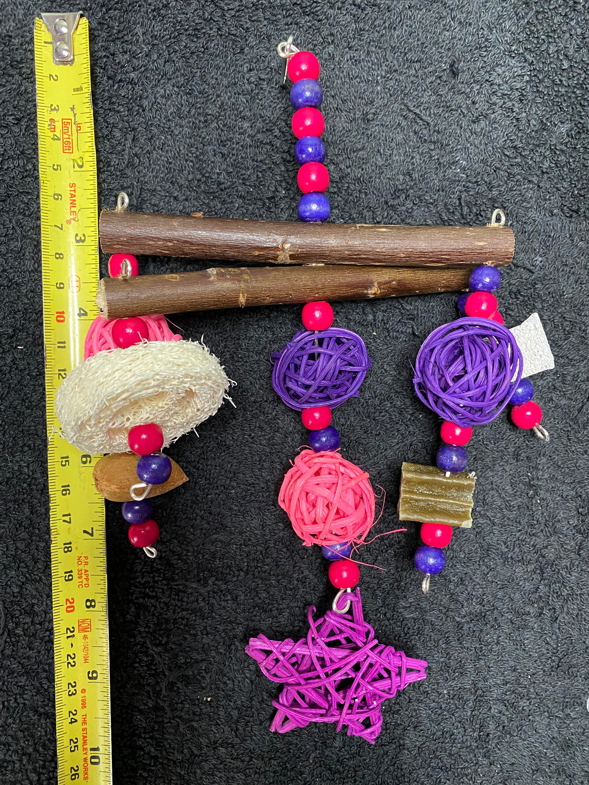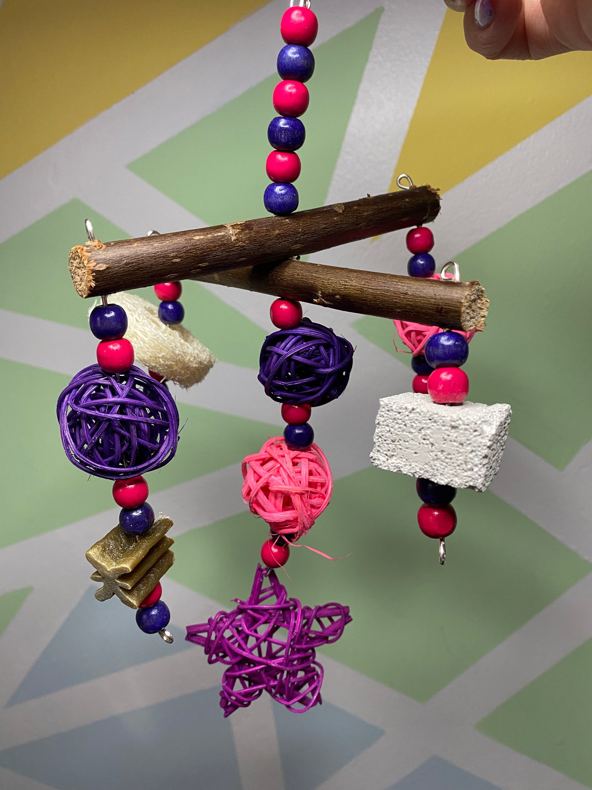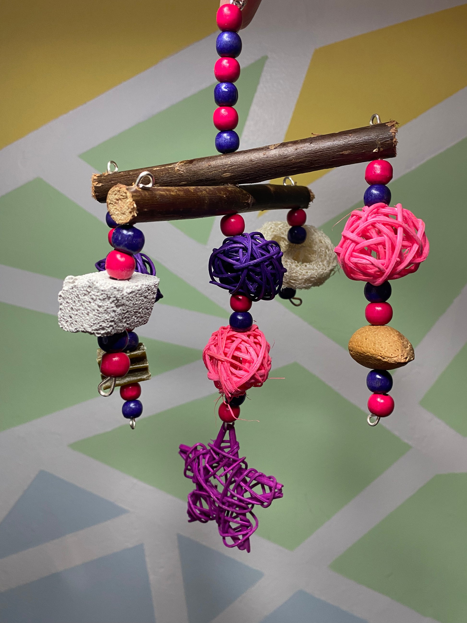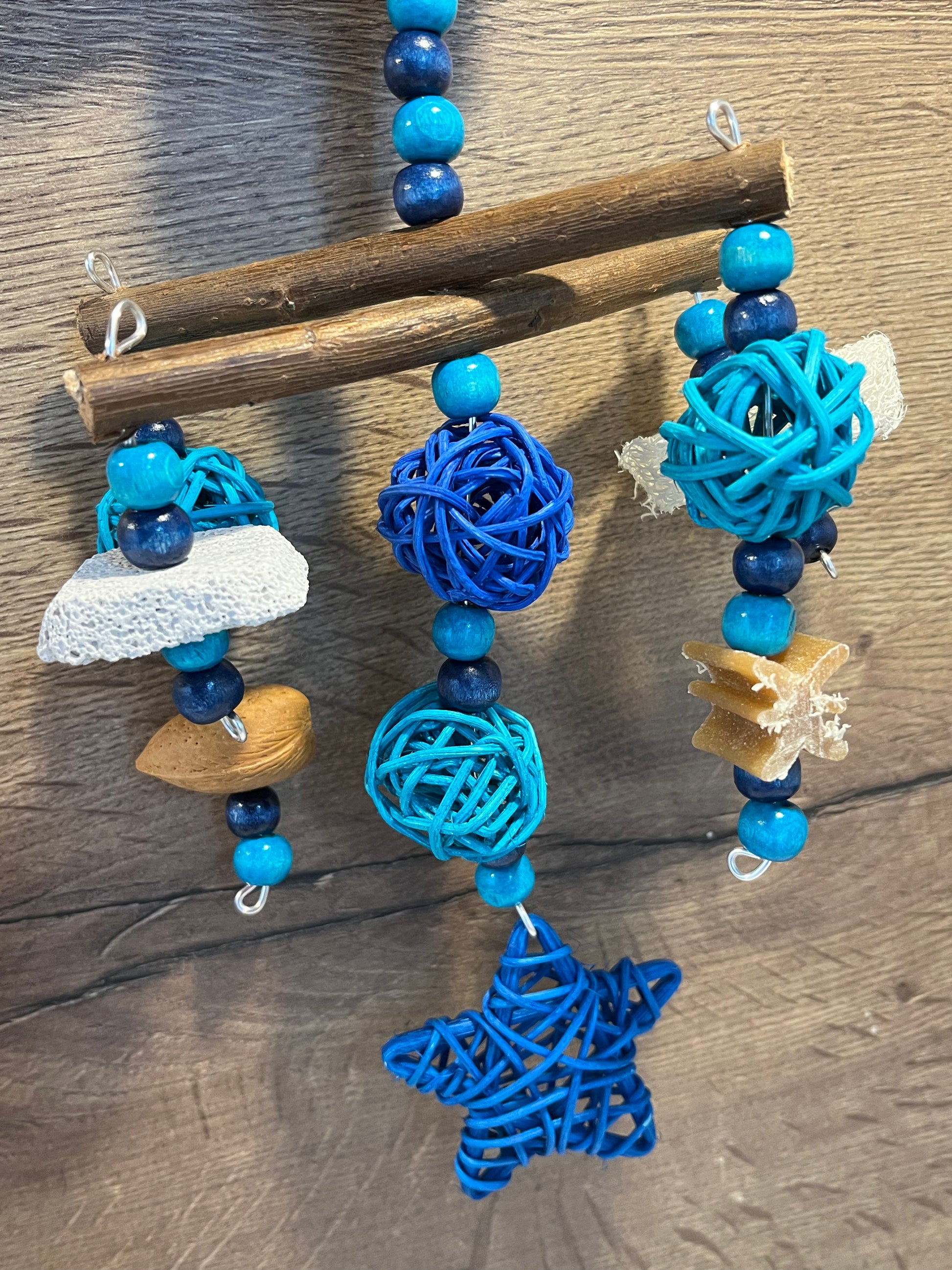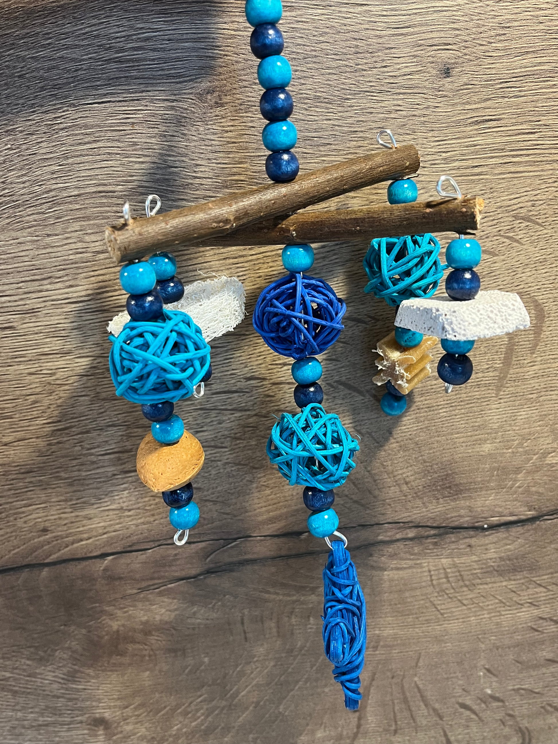 A fun interactive treat toy for your pets. This toy is made using wooden beads, willow, rattan balls/star, loofah, shelled almond, pumice piece and whimzee slice.