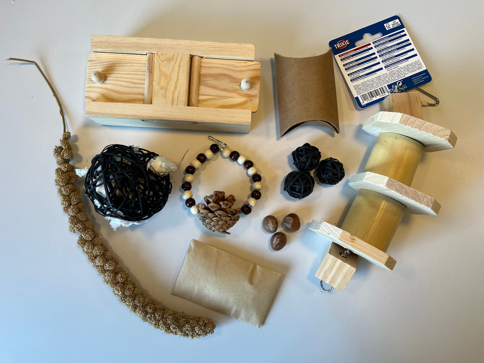 9. Treat Package - Contains a whimzee slice, banana chips, hazelnut, mixed seeds, meal worms and teabag bedding.