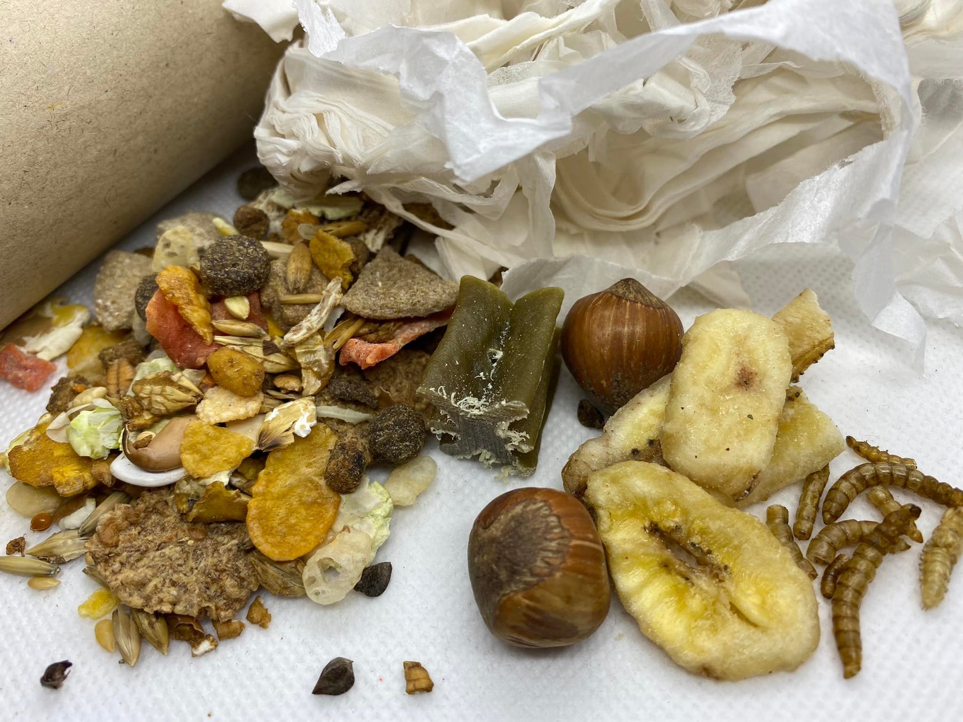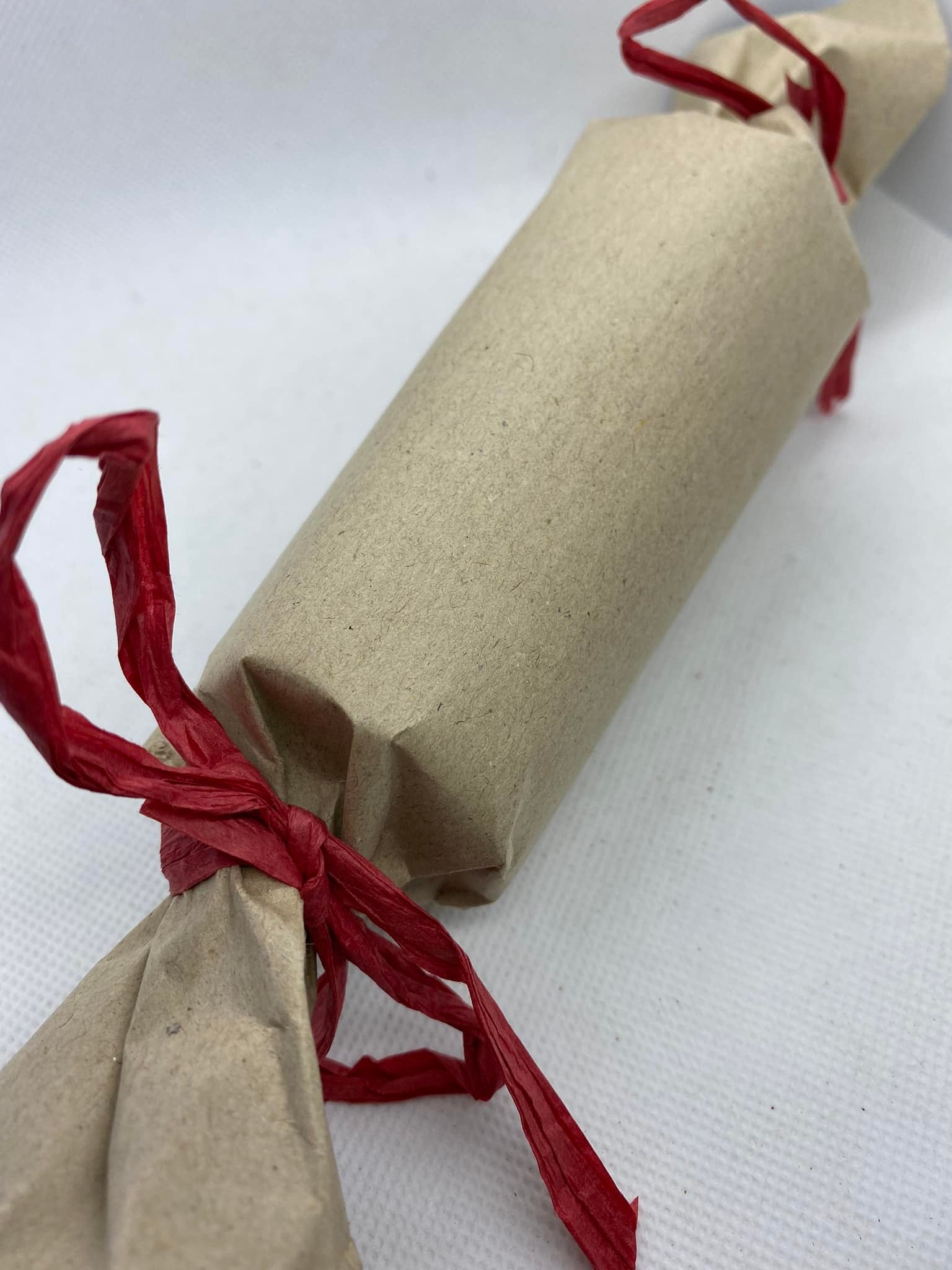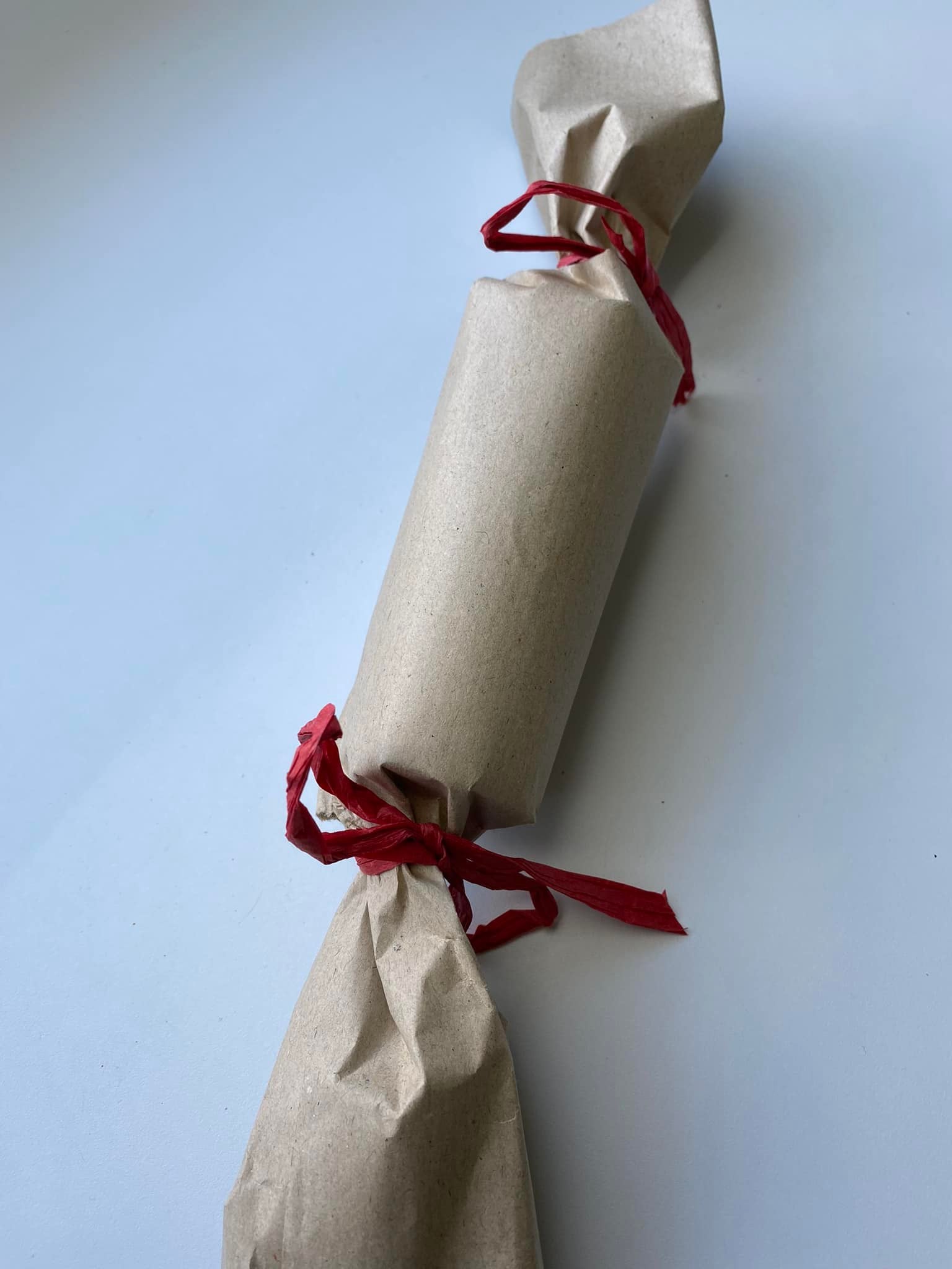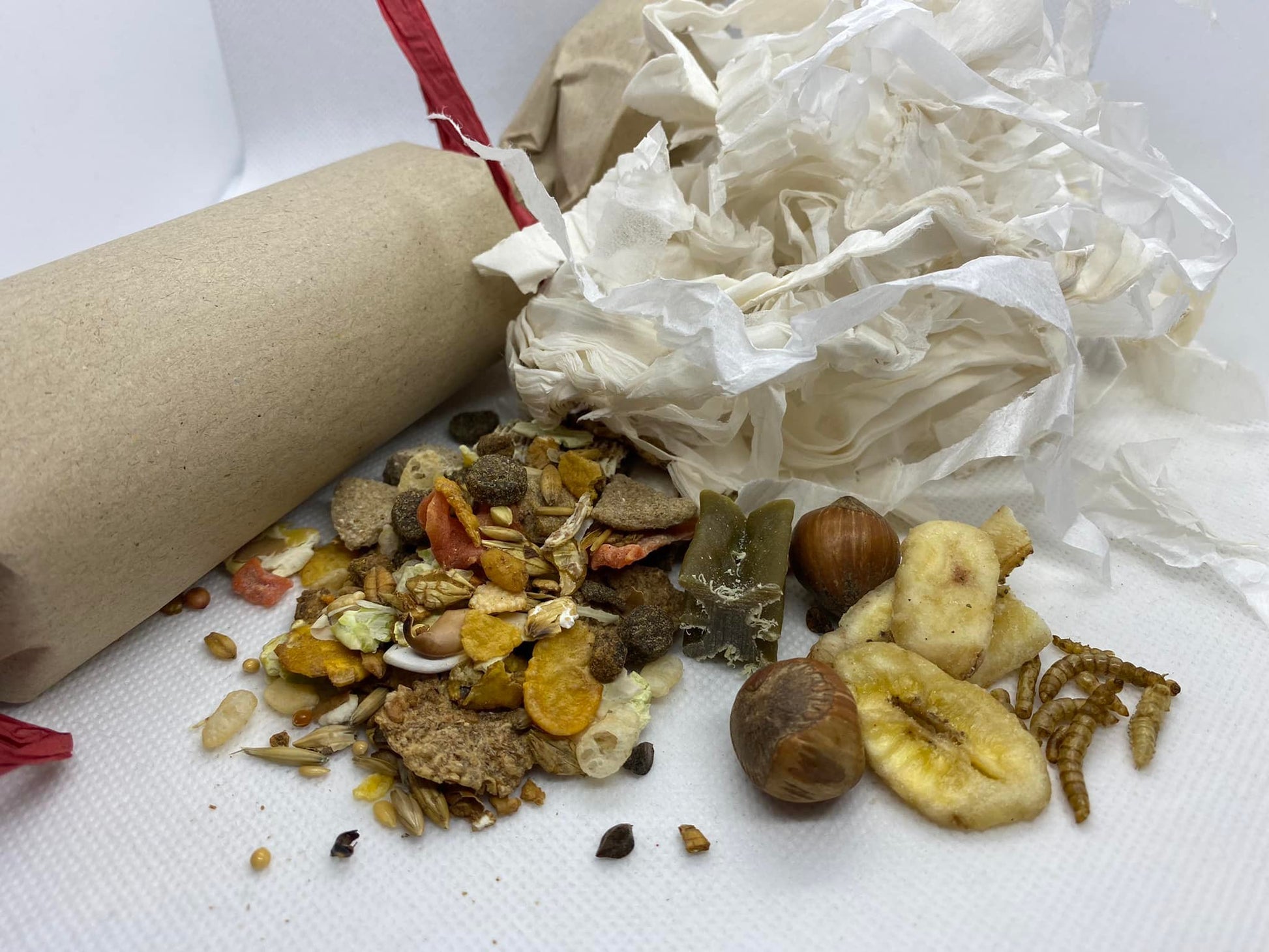 A cardboard tube that is filled with pet safe bedding, whimzee slice, banana chips, shelled nuts, mealworms and my home made rat mix. Wrapped in layers of brown paper and finished with coloured paper ribbon bows.