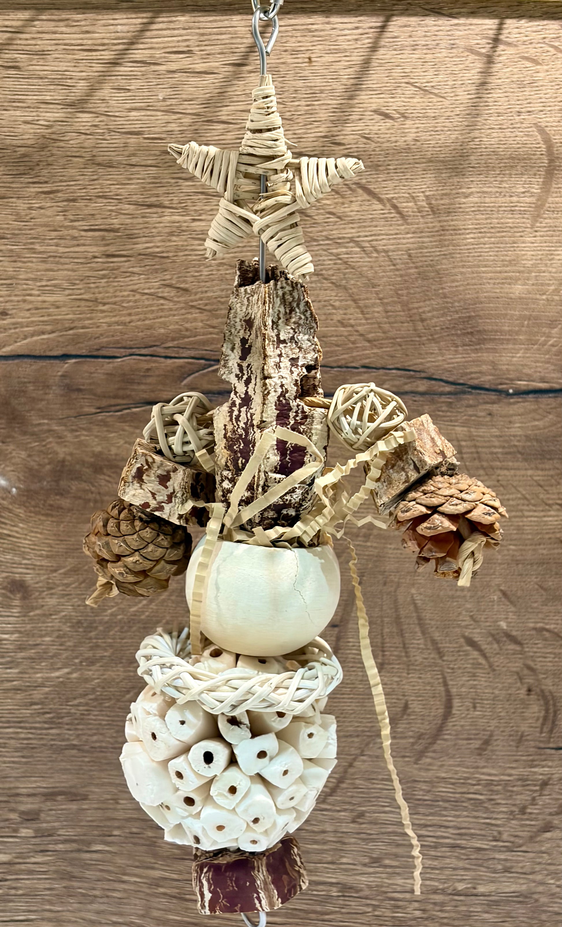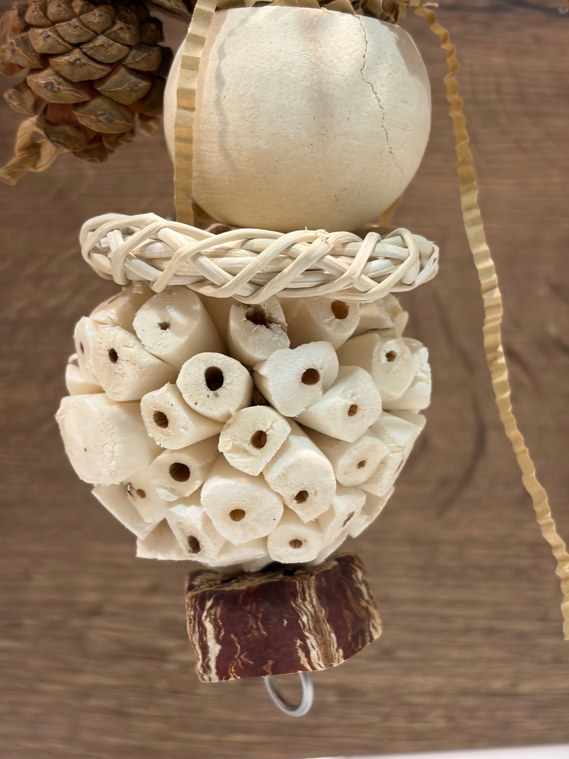 materials; mahogany pieces, vine, paper shreds, rattan ring, sola ball and pinecones.