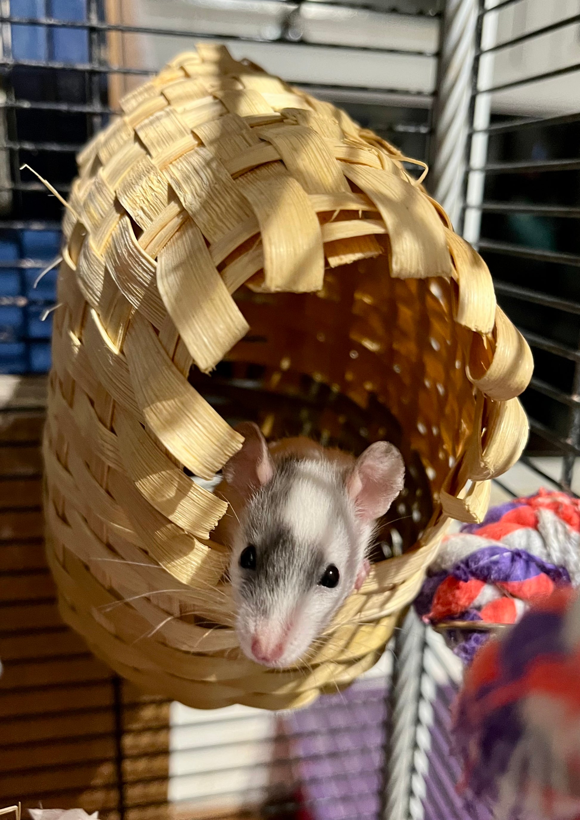 A cute little wicker nest that would be suitable for mice, dwarf rats and small hamsters. Easily hooks onto the cage bars.